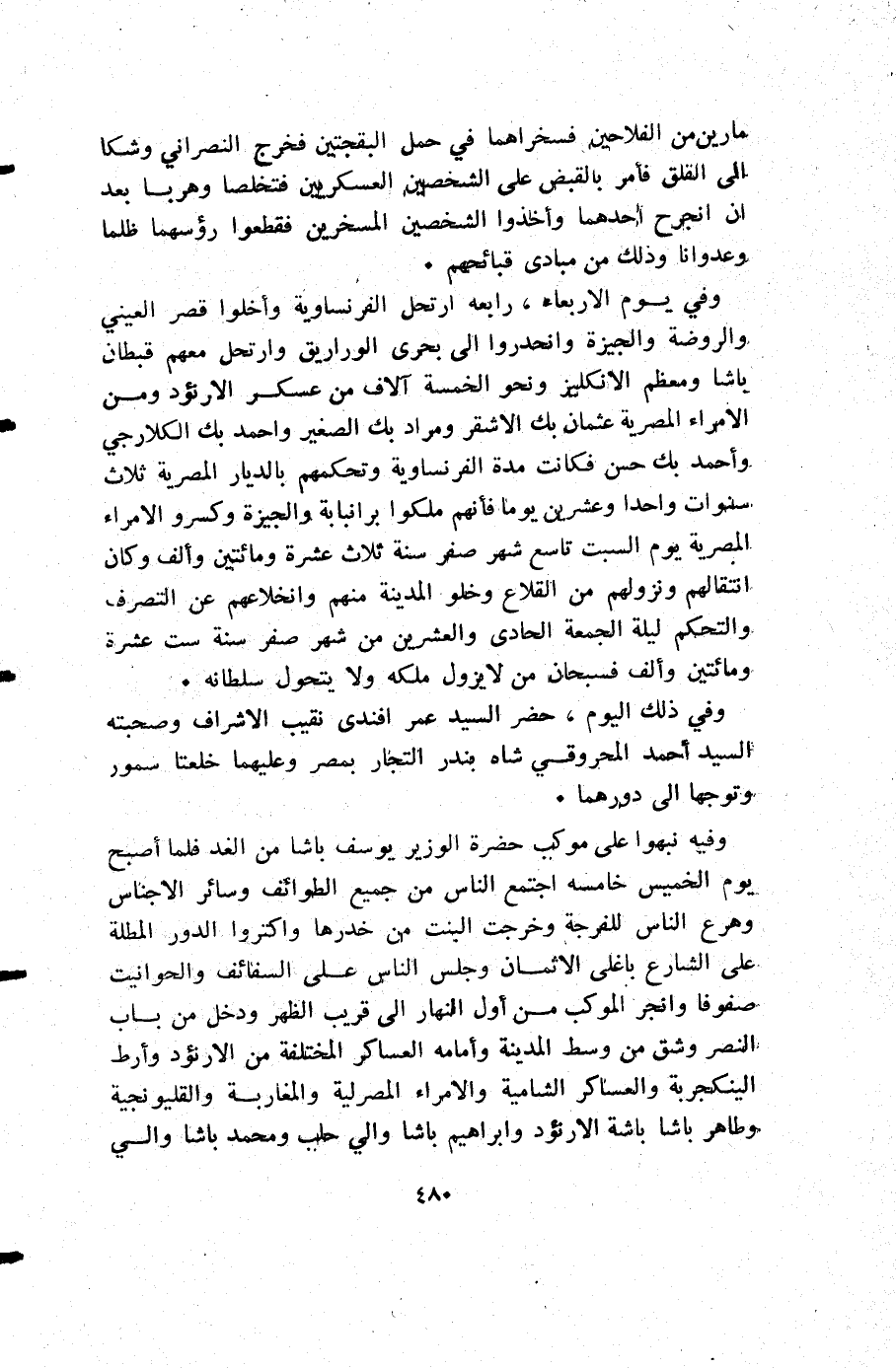 وفي يوم الأربعاء رابعه ارتحل الفرنساوية واخلوا قصر العيني والروضة والجيزة وانحدروا إلى بحري الوراريق وارتحل معهم قبطان باشا ومعظم الانكليز ونحو الخمسة آلاف من عسكر الارنؤد ومن الأمراء المصرية عثمان بك الأشقر ومراد الصغير وأحمد بك الكلارجي وأحمد بك حسن فكانت مدة الفرنساوية وتحكمهم بالديار المصرية ثلاث سنوات واحدا وعشرين يوما فإنهم ملكوا برانبابة والجيزة وكسرو الأمراء المصرية يوم السبت تاسع شهر صفر سنة ثلاث عشرة ومائتين وألف وكان انتقالهم ونزولهم من القلاع وخلو المدينة منهم وانخلاعهم عن التصرف والتحكم ليلة الجمعة الحادي والعشرين من شهر صفر سنة ست عشرة ومائتين وألف فسبحان من لا يزول ملكه ولا يتحول سلطانه.