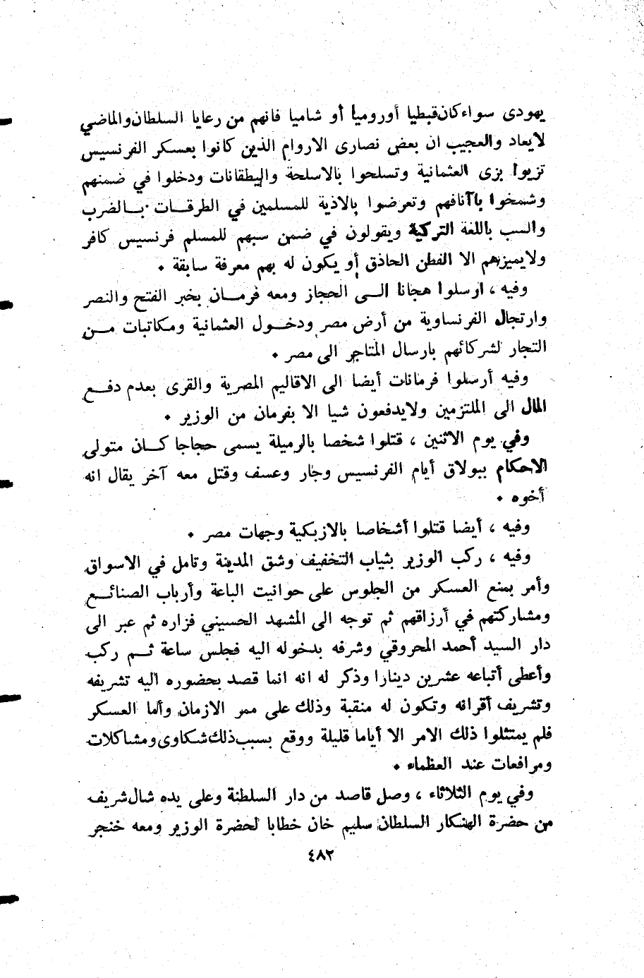 يهودي سواء كان قبطيا أو روميا أو شاميا فإنهم من رعايا السلطان والماضي لا يعاد والعجيب أن بعض نصارى الاروام الذين كانوا بعسكر الفرنسيس تزيوا بزي العثمانية وتسلحوا بالاسلحة واليطقانات ودخلوا في ضمنهم وشمخوا باآنافهم وتعرضوا بالاذية للمسلمين في الطرقات بالضرب والسب باللغة التركية ويقولون في ضمن سبهم للمسلم فرنسيس كافر ولا يميزهم إلا الفطن الحاذق أو يكون له بهم معرفة سابقة.