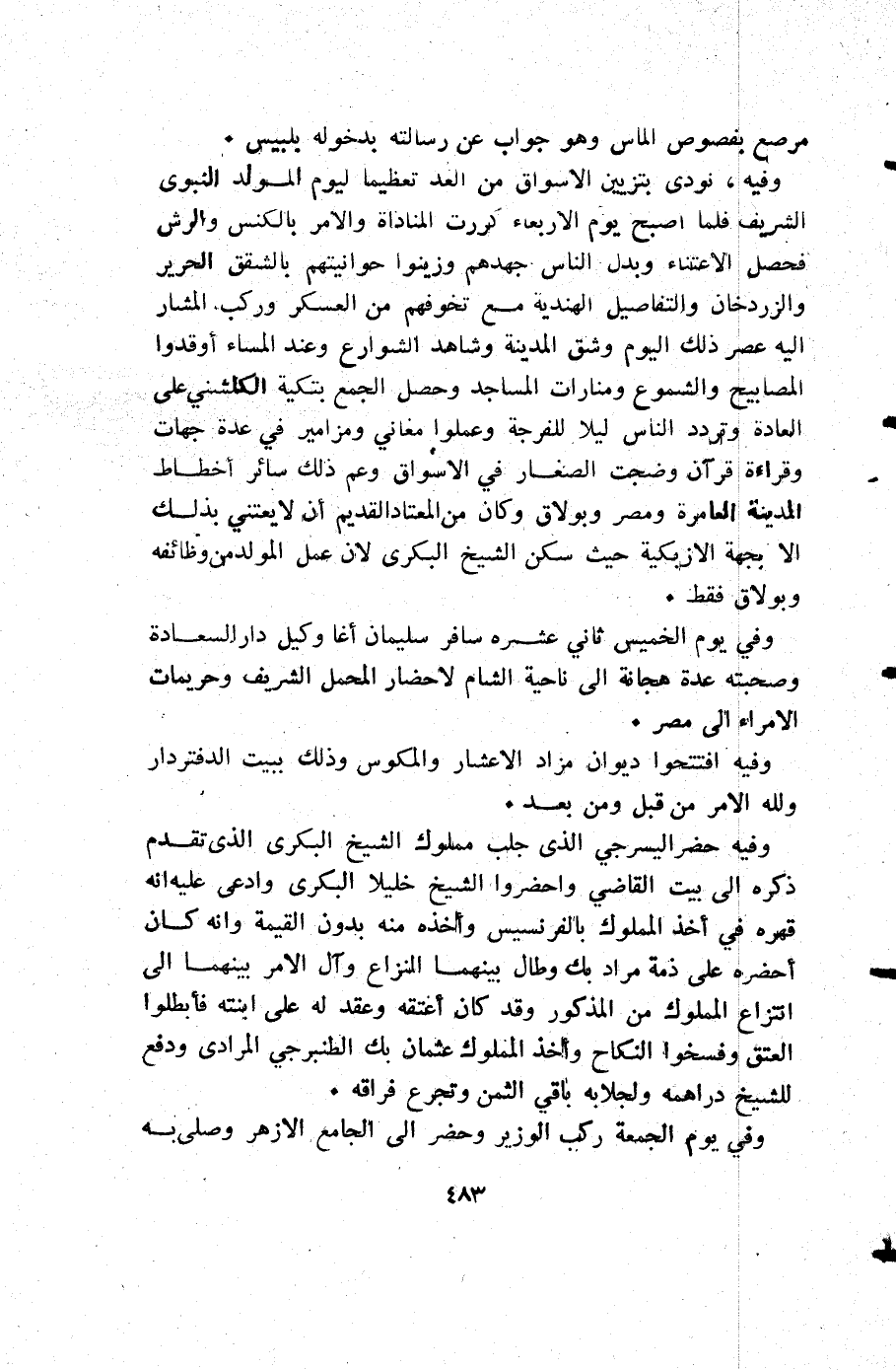وفيه حضر اليسرجي الذي جلب مملوك الشيخ البكري الذي تقدم ذكره إلى بيت القاضي وأحضرو الشيخ خليلا البكري وادعى عليه أنه قهره في أخذ المملوك بالفرنسيس وأخذه منه بدون القيمة وأنه أن أحضره على ذمة مراد بك وطال بينهما النزاع وآل الأمر بينهما إلى انتزاع المملوك من المذكور وقد كان أعتقه وعقد له عل ابنته فأبطلوا العتق وفسخوا النكاح وأخذ المملوك عثمان بك الطنبرجي المرادي ودفع للشيخ دراهمه ولجلابة باقي الثمن وتجرع فراقه.