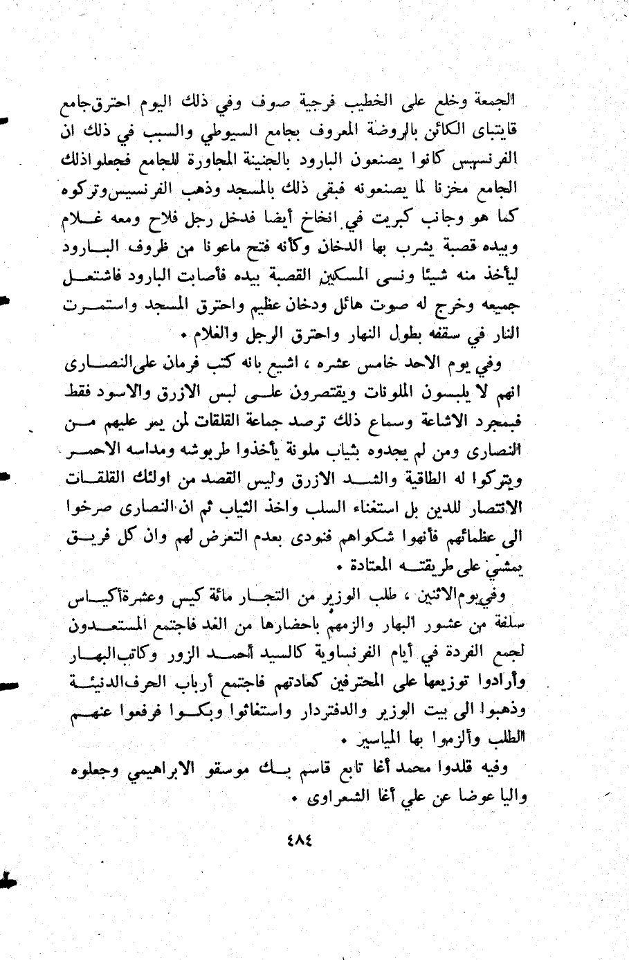 الجمعة وخلع علي الخطيب فرجيه صوف وفي ذلك اليوم احترق جامع قايتباي الكائن بالروضة المعروف بجامع السيوطي والسبب في ذلك أن الفرنسيس كانوا يصنعون البارود بالجنينة المجاورة للجامع فجعلوا ذلك الجامع مخزنا لما يصنعونه فبقى ذلك بالمسجد وذهب الفرنسيس وتركوه كما هووجانب كبريت في انخاخ أيضا فدخل رجل فلاح ومعه غلام وبيده قصبة يشرب بها الدخان وكأنه فتح ماعونا من ظروف البارود ليأخذ منه شيئا ونسي المسكين القصبة بيده فأصابت البارود فاشتعل جميعه وخرج له صوت هائل ودخان عظيم واحترق المسجد واستمرت النار في سقفه بطول النهار واحترق الرجل والغلام.