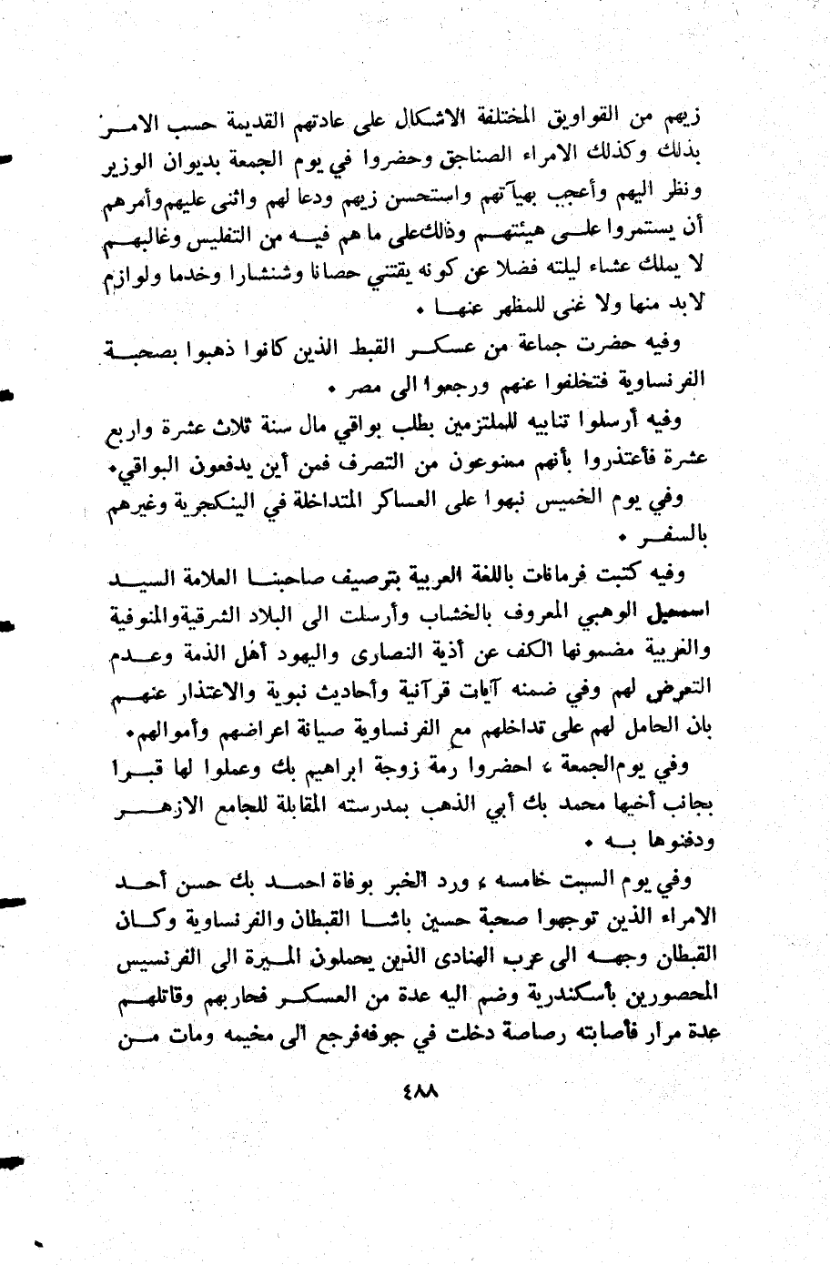 وفيه كتبت فرمانات باللغة العربية بترصيف صاحبنا العلامة السيد إسمعيل الوهبي المعروف بالخشاب وأرسلت إلى البلاد الشرقية والمنوفية والغربية مضمونها الكف عن أذية النصارى واليهود أهل الذمة وعدم التعرض لهم وفي ضمنه آيات قرآنية وأحاديث نبوية والأعتذار عنهم بأن الحامل لهم على تداخلهم مع الفرنساوية صيانة اعراضهم وأموالهم.