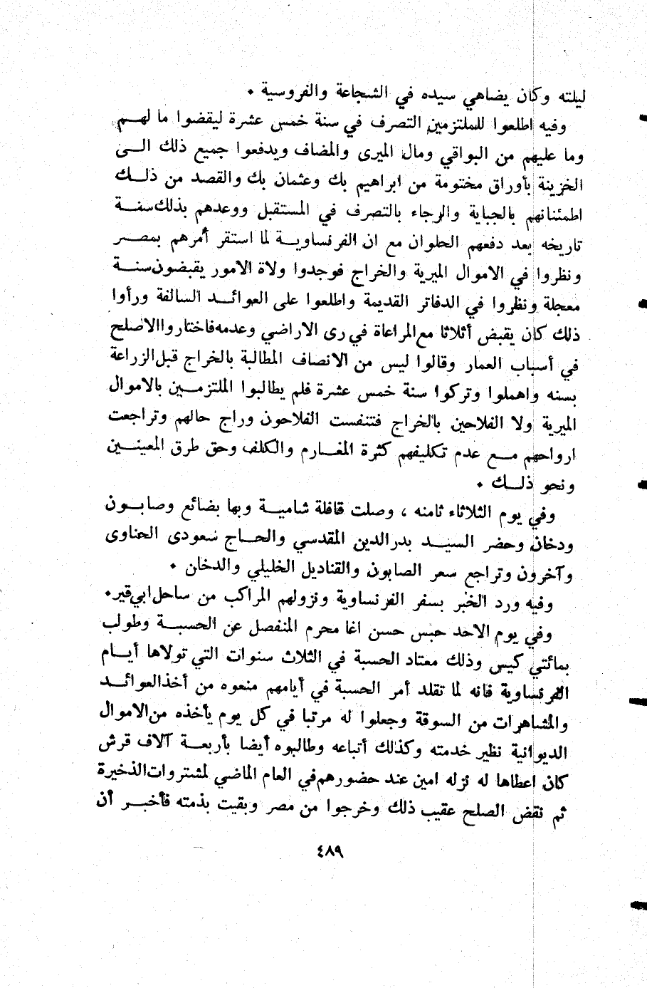 وفيه اطلعوا للملتزمين التصرف في سنة خمس عشرة ليقضوا ما لهم وما عليهم من البواقي ومال الميري والمضاف ويدفعوا جميع ذلك إلى الخزينة بأوراق مختومة من إبراهيم بك وعثمان بك والقصد من ذلك اطمئنانهم بالجباية والرجاء بالتصرف في المستقبل ووعدهم بذلك سنة تاريخه بعد دفعهم الحلوان مع أن الفرنساوية لما استقر أمرهم بمصر ونظروا في الأموال الميرية والخراج فوجدوا ولاة الأمور يقبضون سنة معجلة ونظروا في الدفاتر القديمة واطلعوا على العوائد السالفة ورأوا ذلك كان يقبض أثلاثا مع المراعاة في ري الاراضي وعدمه فاختاروا والأصلح في أسباب العمار وقالوا ليس من الانصاف المطالبة بالخراج قبل الزراعة بسنة واهملوا وتركوا سنة خمس عشرة فلم يطالبوا الملتزمين بالاموال الميرية ولا الفلاحين بالخراج فتنفست الفلاحون وراج حالهم وتراجعت ارواحهم مع عدم تكليفهم كثرة المغارم والكلف وحق طرق المعينين ونحو ذلك.
