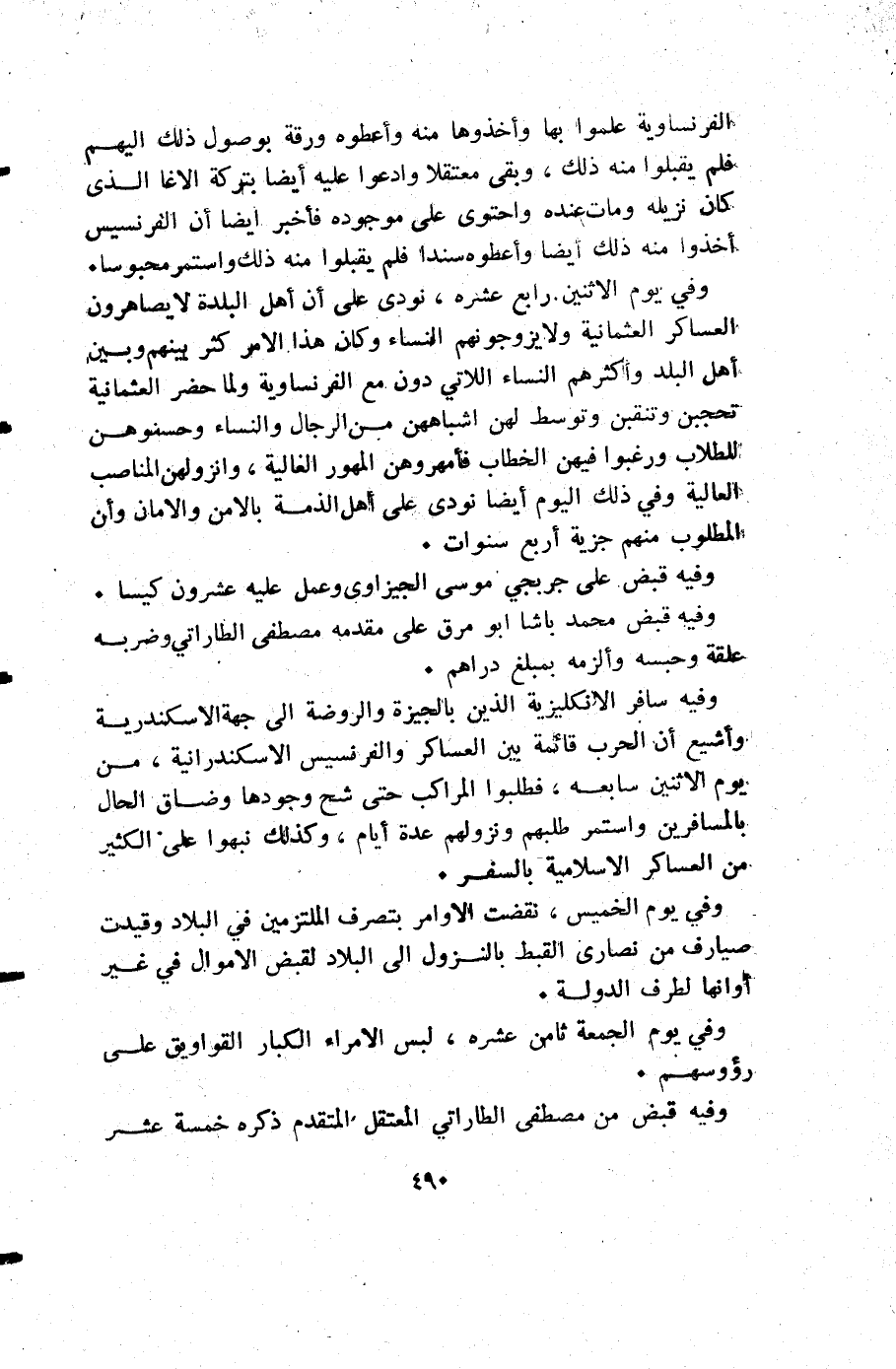 وفي يوم الإثنين رابع عشره نودي على أن أهل البلدة لا يصاهرون العساكر العثمانية ولا يزوجونهم النساء وكان هذا الأمر كثر بينهم وبين أهل البلد وأكثرهم النساء اللاتي دون مع الفرنساوية ولما حضر العثمانية تحجبن وتنقبن وتوسطن لهن اشباهن من الرجال والنساء وحسنوهن للطلاب ورغبوا فيهن الخطاب فأمهروهن المهور الغالية وانزولهن المناصب العالية وفي ذلك اليوم أيضا نودي على أهل الذمة بالأمن والأمان وأن المطلوب منهم جزية أربع سنوات.