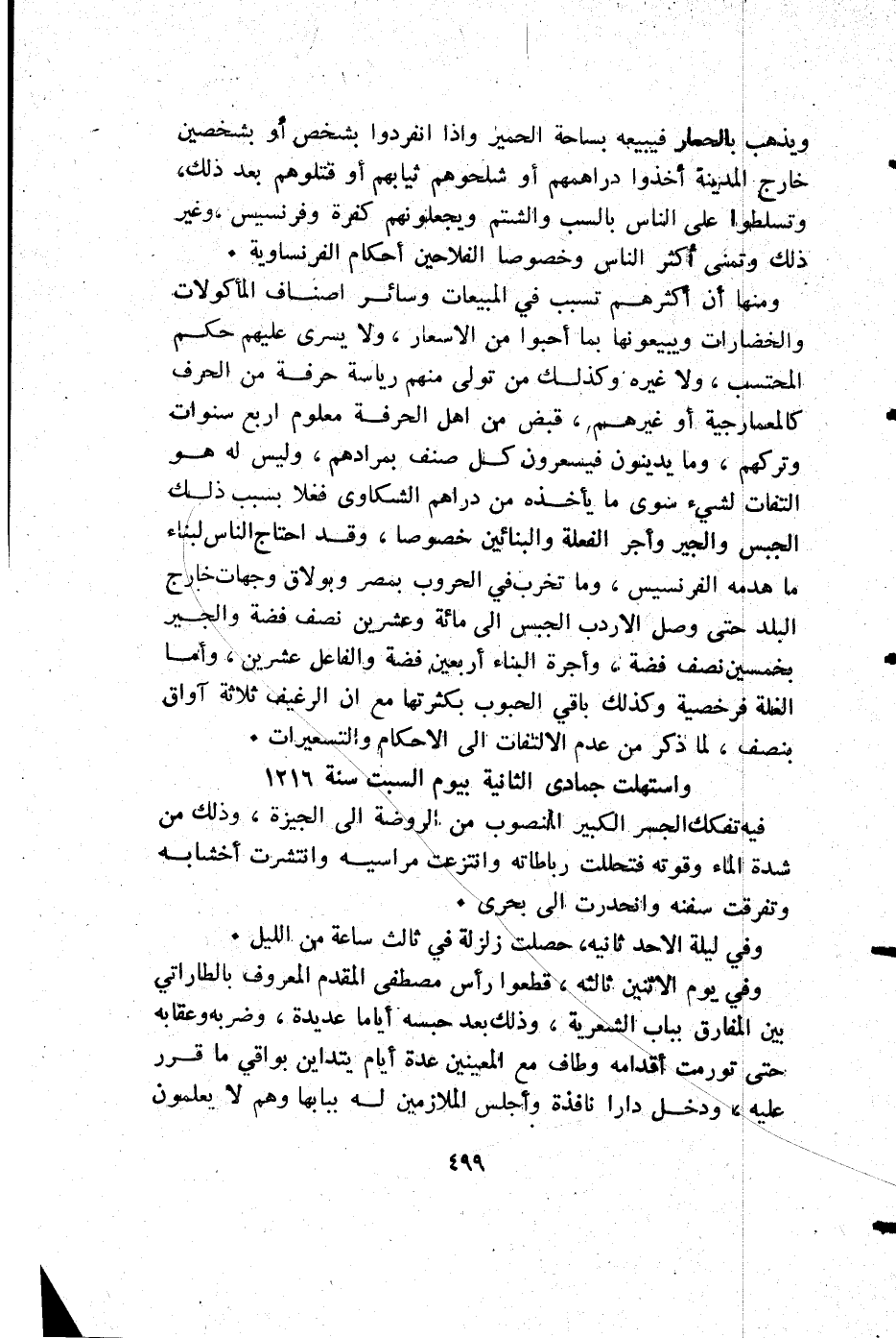 ويذهب بالحمار فيبيعه بساحة الحمير وإذا انفردوا بشخص أو بشخصين خارج المدينة أخذوا دراهمهم أو شلحوهم ثيابهم أو قتلوهم بعد ذلك وتسلطوا على الناس بالسب والشتم ويجعلونهم كفرة وفرنسيس وغير ذلك وتمنى أكثر الناس وخصوصا الفلاحين أحكام الفرنساوية.