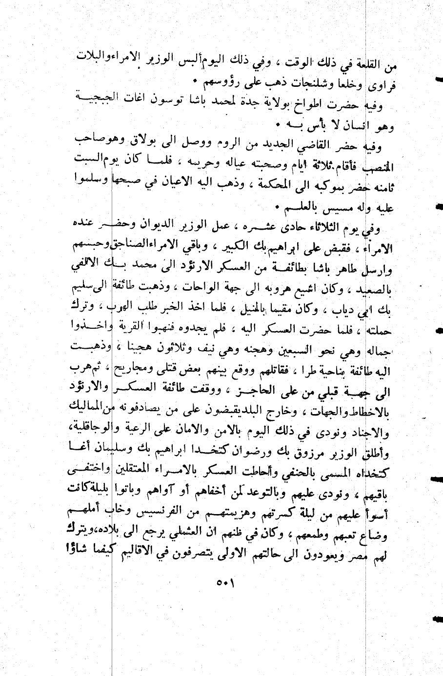 وفي يوم الثلاثاء حادي عشره عمل الوزير الديوان وحضر عنده الأمراء فقبض على إبراهيم بك الكبير وباقي الأمراء الصناجق وحبسهم وأرسل طاهر باشا بطائفة من العسكر الارنؤد إلى محمد بك الألفي بالصعيد وكان اشيع هروبه إلى جهات الواحات وذهبت طائفة إلى سليم بك أبي دياب وكان مقيما بالمنيل فلما أخذ الخبر طلب الهرب وترك حملته فلما حضرت العسكر إليه فلم يجدوه فنهبوا القرية وأخذوا جماله وهي نحو السبعين وهجنه وهي نيف وثلاثون هجينا وذهبت إليه طائفة بناحية طرا فقاتلهم ووقع بينهم بعض قتلى ومجاريح ثم هرب إلى جهة قبلي من على الحاجز ووقفت طائفة العسكر والارنؤد بالاخطاط والجهات وخارج البلد يقبضون على من يصادفونه من المماليك والأجناد ونودي في ذلك اليوم بالأمن والأمان على الرعية والوجاقلية وأطلق الوزير مرزوق بك ورضوان كتخدا إبراهيم بك وسليمان أغا كتخداه المسمى بالحنفي وأحاطت العسكر بالامراء المعتقلين واختفى باقيهم ونودي عليهم وبالتوعد لمن أخفاهم أو آواهم وباتوا بليلة كانت أسوأ عليهم من ليلة كسرتهم وهزيمتهم من الفرنسيس وخاب أملهم وضاع تعبهم وطمعهم وكان في ظنهم أن العثملي يرجع إلى بلاده ويترك لهم مصر ويعودون إلى حالتهم الأولى يتصرفون في الاقاليم كيفما شاؤا
