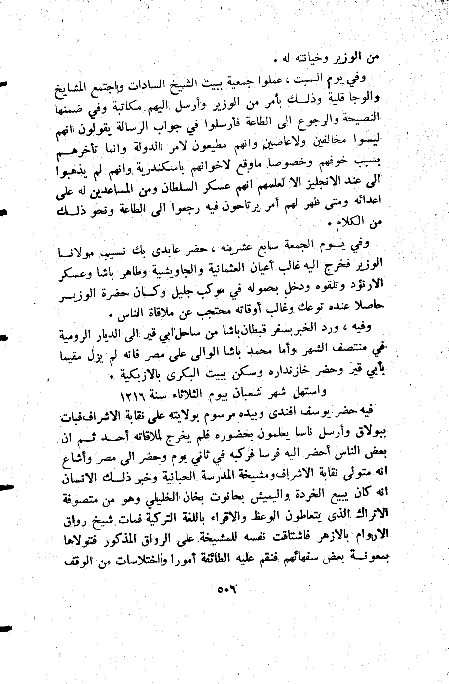 وفي يوم السبت عملوا جمعية ببيت الشيخ السادات واجتمع المشايخ والوجاقلية وذلك بأمر من الوزير وأرسل إليهم مكاتبة وفي ضمنها النصيحة والرجوع إلى الطاعة فأرسلوا في جواب الرسالة يقولون أنهم ليسوا مخالفين ولا عاصين وأنهم مطيعون لأمر الدولة وإنما تاخرهم بسبب خوفهم وخصوصا ما وقع لاخوانهم باسكندرية وأنهم لم يذهبوا إلى عند الانجليز لعلمهم أنهم عسكر السلطان ومن المساعدين له على أعدائه ومتى ظهر لهم أمر يرتاحون فيه رجعوا إلى الطاعة ونحو ذلك من الكلام.