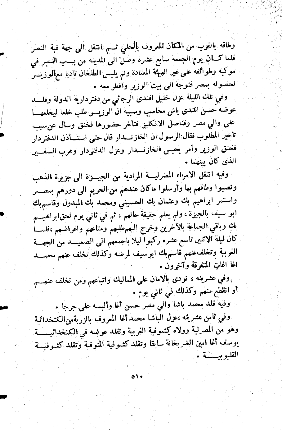 وفي تلك الليلة عزل خليل أفندي الرجائي من دفتردارية الدولة وقلد عوضه حسن أفندي باش محاسب وسببه أن الوزير طلب خلعا ليخلعها على والي مصر وقناصل الانكليز فتأخر حضورها فخنق وسأل عن سبب تأخير المطلوب فقال الرسول أن الخازندار قال حتى استاذن الدفتردار فحنق الوزير وأمر بحبس الخازندار وعزل الدفتردار وهرب السفير الذي كان بينهما.