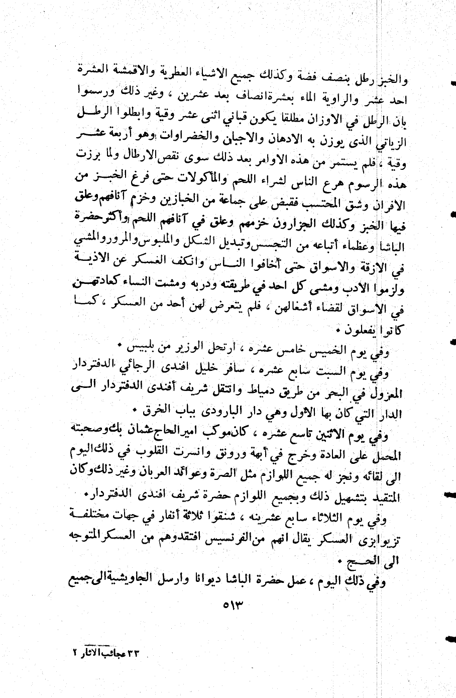 والخبز رطل بنصف فضة وكذلك جميع الاشياء العطرية والاقمشة العشرة أجد عشر والراوية الماء بعشرة انصاف بعد عشرين وغير ذلك ورسموا بأن الرطل في الاوزان مطلقا يكون قباني اثني عشر وقية وابطلوا الرطل الزياتي الذي يوزن به الأدهان والاجبان والخضراوات وهو أربعة عشر وقية فلم يستمر من هذه الاوامر بعد ذلك سوى نقص الارطال ولما برزت هذه الرسوم هرع الناس لشراء اللحم والماكولات حتى فرغ الخبز من الافران وشق المحتسب فقبض على جماعة من الخبازين وخزم آنافهم وعلق فيها الخبز وكذلك الجزارون خزمهم وعلق في آنافهم اللحم وأكثر حضرة الباشا وعظماء أتباعه من التجسس وتبديل الشكل والملبوس والمرور والمشي في الأزقة والأسواق حتى أخافوا الناس وانكف العسكر عن الاذية ولزموا الأدب ومشى كل واحد في طريقته ودربه ومشت النساء كعادتهم في الأسواق لقضاء أشغالهم فلم يتعرض لهم أجد من العسكر كما كانوا يفعلون.