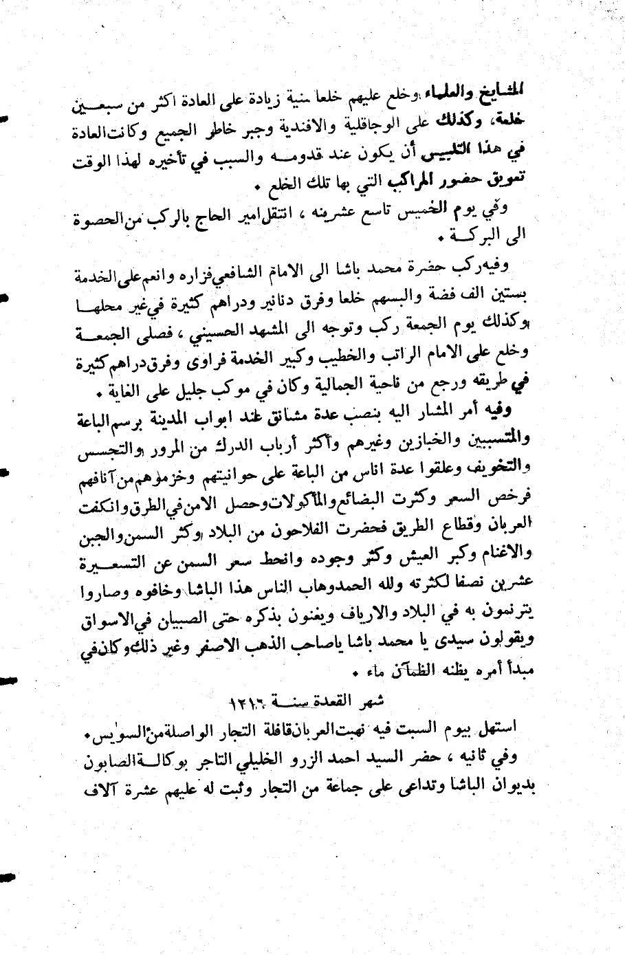 وفيه أمر المشار إليه بنصب عدة مشانق عند ابواب المدينة برسم الباعة والمتسببين والخبازين وغيرهم وأكثر أرباب الدرك من المرور والتجسس والتخويف وعلقوا عدة أناس من الباعة على حوانيتهم وخزموهم من آنافهم فرخص السعر وكثرت البضائع اوالمأكولات وحصل الأمن في الطرق وانكفت العربان وقطاع الطريق فحضرت الفلاحون من البلاد وكثر السمن والجبن والأغنام وكبر العيش وكثر وجوده وانحط سعر السمن عن التسعيرة عشرين نصفا لكثرته ولله الحمد وهاب الناس هذا الباشا وخافوه وصاروا يترنمون به في البلاد والارياف ويغنون بذكره حتى الصبيان في الأسواق ويقولون سيدي يا محمد باشا يا صاحب الذهب الأصفر وغير ذلك وكان في مبدأ أمره يظنه الظمآن ماء.