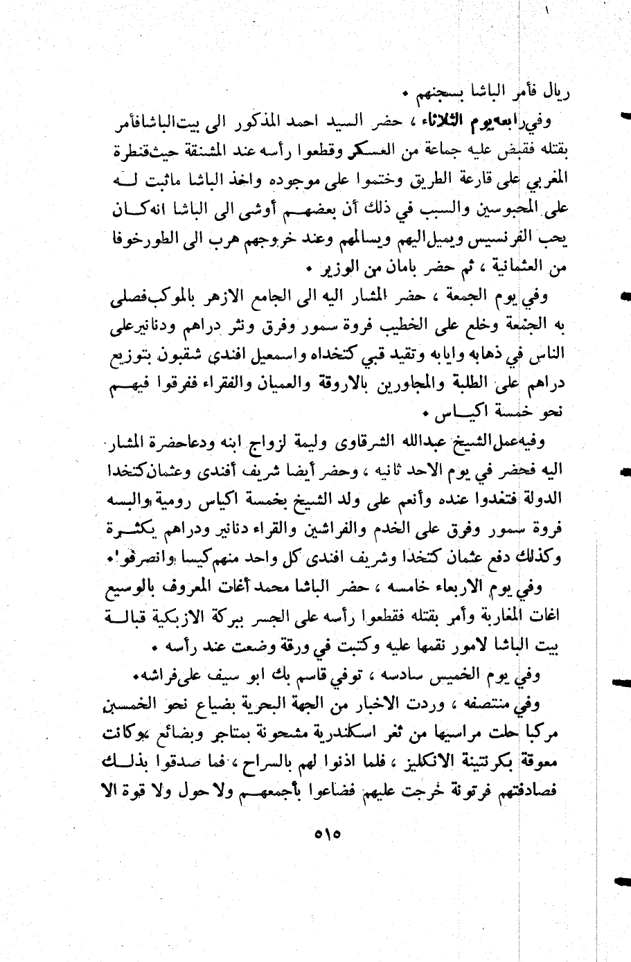 وفي رابعه يوم الثلاثاء حضر السيد أحمد المذكور إلى بيت الباشا فأمر بقتله فقبض عليه جماعة من العسكر وقطعوا رأسه عند المشنقة حيث قنطرة المغربي على قارعة الطريق وختموا على موجوده وأخذ الباشا ما ثبت له على المحبوسين والسبب في ذلك بعضهم أوشى إلى الباشا أنه كان بحب الفرنسيس ويميل إليهم ويسالمهم وعند خروجهم هرب إلى الطور خوفا من العثمانية ثم حضر بأمان من الوزير.