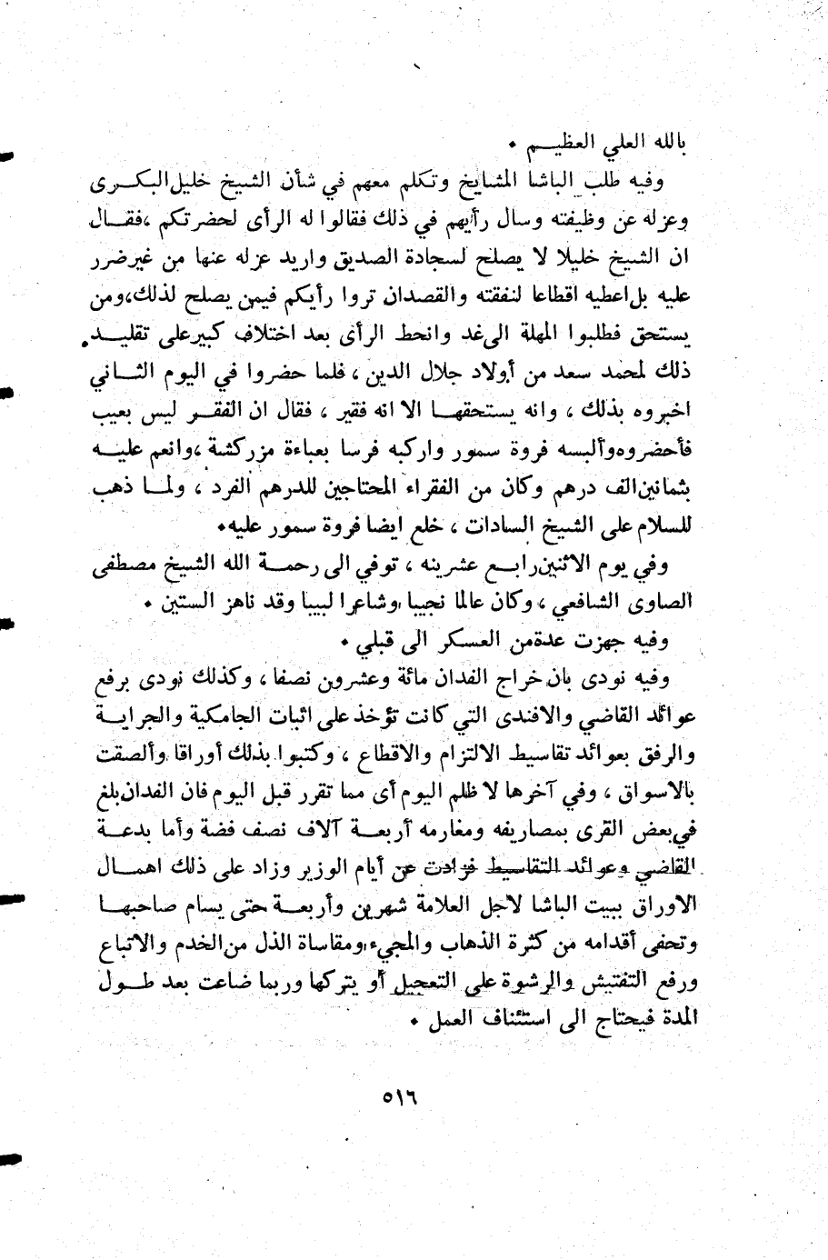 وفيه نودي بأن خراج الفدان مائة وعشرون نصفا وكذلك نودي برفع عوائد القاضي والأفندي التي كانت تؤخذ على اثبات الجامكية والجراية والرفق بعوائد تقاسيط الالتزام والاقطاع وكتبوا بذلك أوراقا وألصقت بالأسواق وفي آخرها لا ظلم اليوم أي مما تقرر قبل اليوم فإن الفدان بلغ في بعض القرى بمصاريفه ومغارمه أربعة آلاف نصف فضة وأما بدعة القاضي وعوائد التقاسيط فزادت عن أيام الوزير وزاد على ذلك إهمال الأوراق ببيت الباشا لأجل العلامة شهرين وأربعة حتى يسام صاحبها وتحفى أقدامه من كثرة الذهاب والمجيء ومقاساة الذل من الخدم والاتباع ورفع التفتيش والرشوة على التعجيل أو يتركها وربما ضاعت بعد طول المدة فيحتاج إلى استئناف العمل