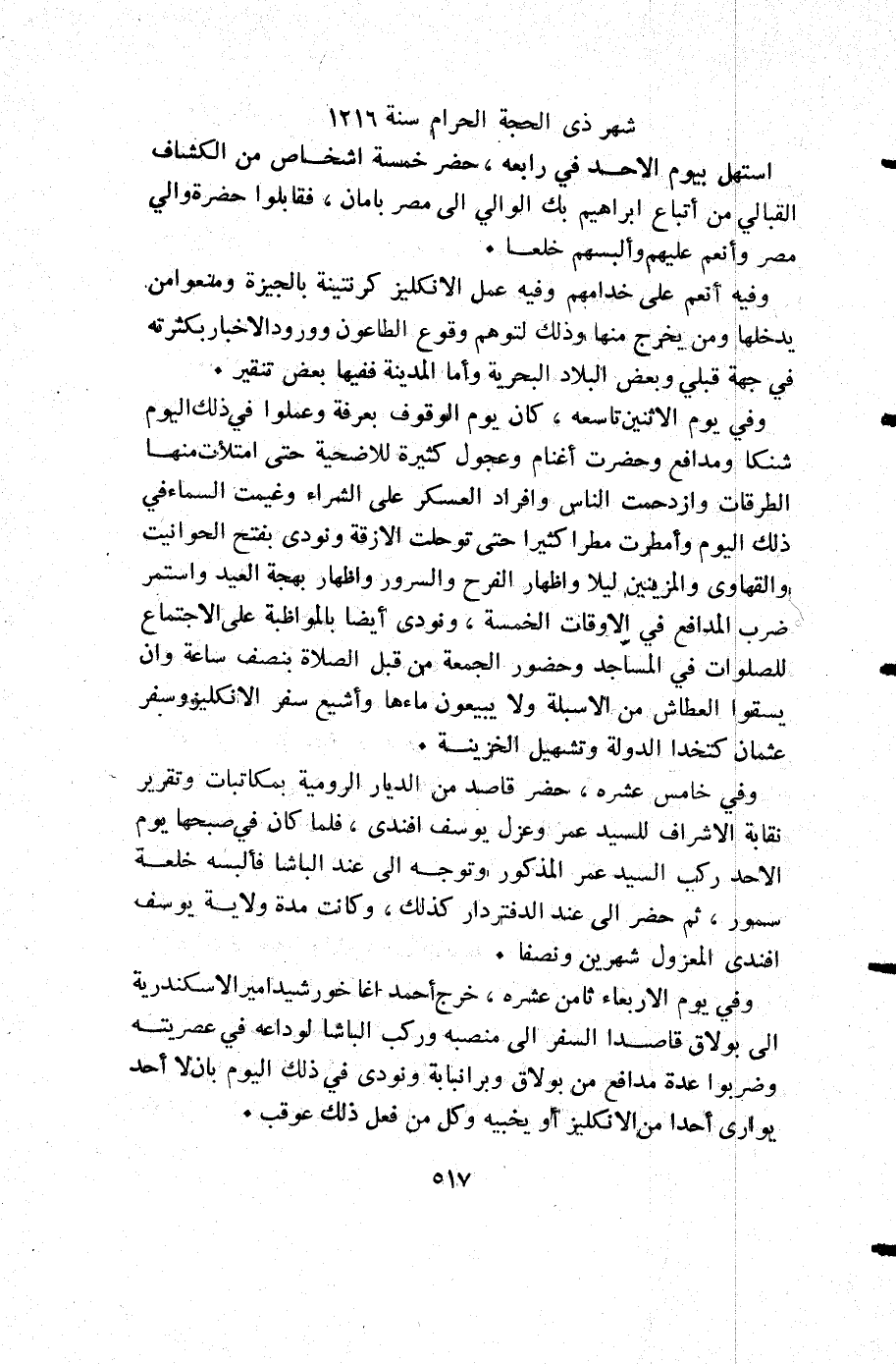 وفيه أنعم على خدامهم وفيه عمل الانكليز كرنتينة بالجيزة ومنعوا من يدخلها ومن يخرج منها وذلك لتوهم وقوع لطاعون وورود الأخبار بكثرته في جهة قبلي وبعض البلاد البحرية وأما المدينة ففيها بعض تنقير.