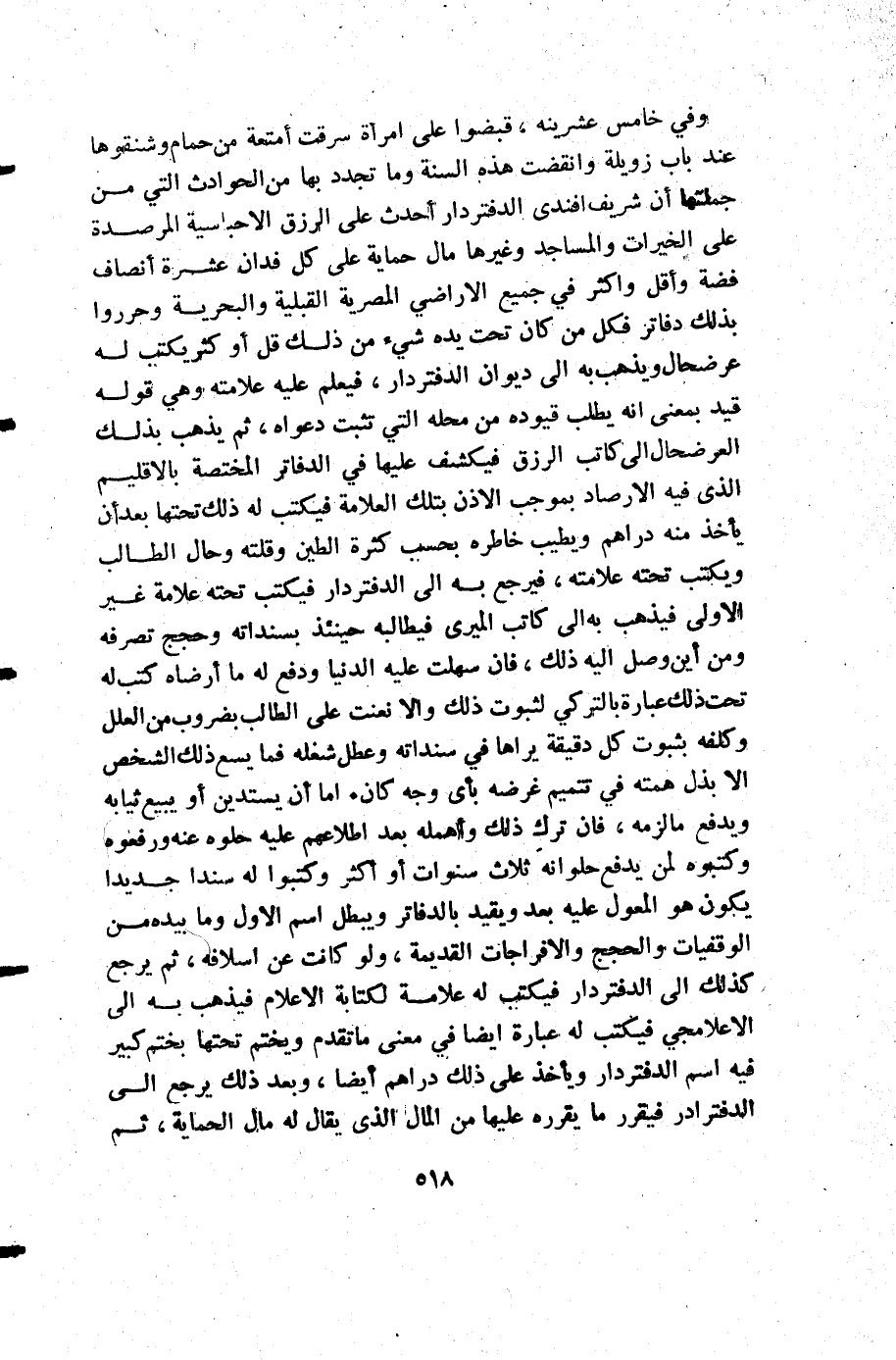 وفي خامس عشرينه قبضوا على امراة سرقت امتعة من حمام وشنقوها عند باب زويله وانقضت هذه السنة وما تجدد بها من الحوادث التي من جملتها أن شريف أفندي الدفتردار أحدث على الرزق الاحباسية المرصدة على الخيرات والمساجد وغيرها مال حماية على كل فدان عشرة أنصاف فضة وأقل وأكثر في جميع الأراضي المصرية القبلية والبحرية وحرروا بذلك دفاتر فكل من كان تحت يده شيء من ذلك قل أو كثر يكتب له عرضحال ويذهب به إلى ديوان الدفتردار فيعلم عليه علامته وهي قوله قيد بمعنى أنه يطلب قيوده من محله التي تثبت دعواه ثم يذهب بذلك العرضحال إلى كاتب الرزق فيكشف عليها في الدفاتر المختصة بالاقليم الذي فيه الارصاد بموجب الاذن بتلك العلامة فيكتب له ذلك تحتها بعد أن يأخذ منه دراهم ويطيب خاطره بحسب كثرة الطين وقلته وحال الطالب ويكتب تحته علامته فيرجع به إلى الدفتردار فيكتب تحته علامة غير الأولى فيذهب به إلى كاتب الميري فيطالبه حينئذ بسنداته وحجج تصرفه ومن أين وصل إليه ذلك فإن سهلت عليه الدنيا ودفع له ما أرضاه كتب له تحت ذلك عبارة بالتركي لثبوت ذلك وإلا نعنت على الطالب بضروب من العلل وكلفة بثبوت كل دقيقة يراها في سنداته وعطل شغله فما يسع ذلك الشخص إلا بذل همته في تتميم غرضه بأي وجه كان أما أن يستدين أو يبيع ثيابه ويدفع ما لزمه فإن ترك ذلك وأهمله بعد اطلاعهم عليه حلوه عنه ورفعوه وكتبوه لمن يدفع حلوانه ثلاث سنوات أو أكثر وكتبوا له سندا جديدا يكون هو المعول عليه بعد ويقيد بالدفاتر ويبطل اسم الأول وما بيده من الوقفيات والحجج والأفراجات القديمة ولو كانت عن اسلافه ثم يرجع كذلك إلى الدفتردار فيكتب له علامة لكتابة الأعلام فيذهب به إلى الأعلامجي فيكتب له عبارة أيضا في معنى ما تقدم ويختم تحتها بختم كبير فيه اسم الدفتردار ويأخذ على ذلك دراهم أيضا وبعد ذلك يرجع إلى الدفتردار فيقرر ما يقرره عليها من المال الذي يقال له مال الحماية ثم