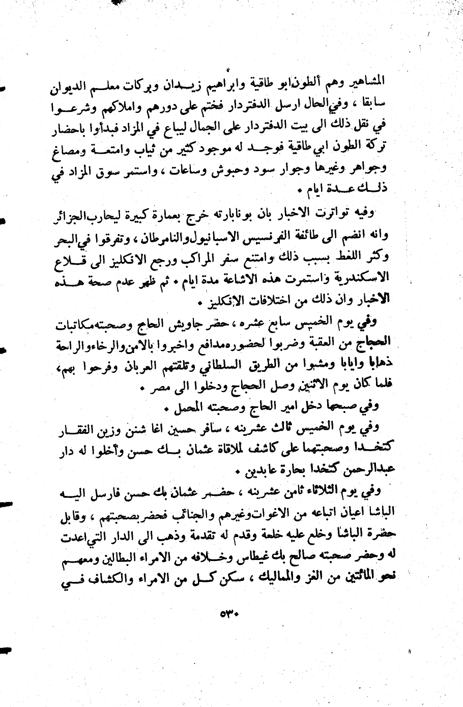 وفي يوم الخميس ثالث عشرينه سافر حسين اغا شنن وزين الفقار كتخدا وصحبتهما على كاشف لملاقاة عثمان بك حسن وأخلوا له دار عبد الرحمن كتخدا بحارة عابدين.