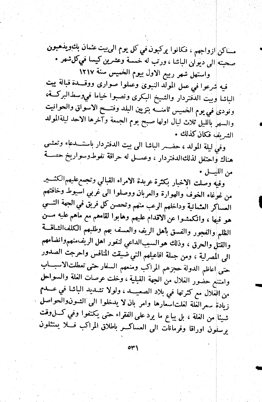 وفي ليلة المولد حضر الباشا إلى بيت الدفتردار باستدعاء وتعشى هناك واحتفل لذلك الدفتردار وعمل له حراقة نفوط وسواريخ حصة من الليل.