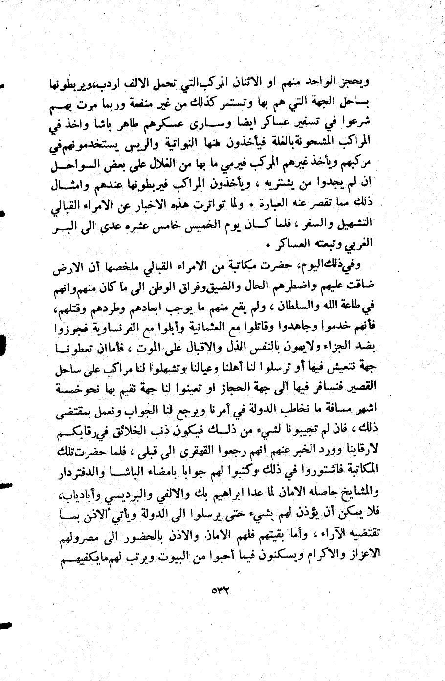 ويحجز الواحد منهم أو الإثنان المركب التي تحمل الألف اردب ويربطونها بساحل الجهة التي هم بها وتستمر كذلك من غير منفعة وربما مرت بهم شرعوا في تسفير عساكر أيضا وسارى عسكرهم طاهر باشا وأخذ في المراكب المشحونة بالغلة فيأخذون منها النواتية والريس يستخدمونه في مركبهم ويأخذ غيرهم المركب فيرمي ما بها من الغلال على بعض السواحل أن لم يجدوا من يشتريه ويأخذون المراكب فيربطونها عندهم وامثال ذلك مما تقصر عنه العبارة ولما تواترت هذه الأخبار عن الأمراء القبالي التشهيل والسفر فلما كان يوم الخميس خامس عشره عدى إلى البر الغربي وتبعته العساكر.