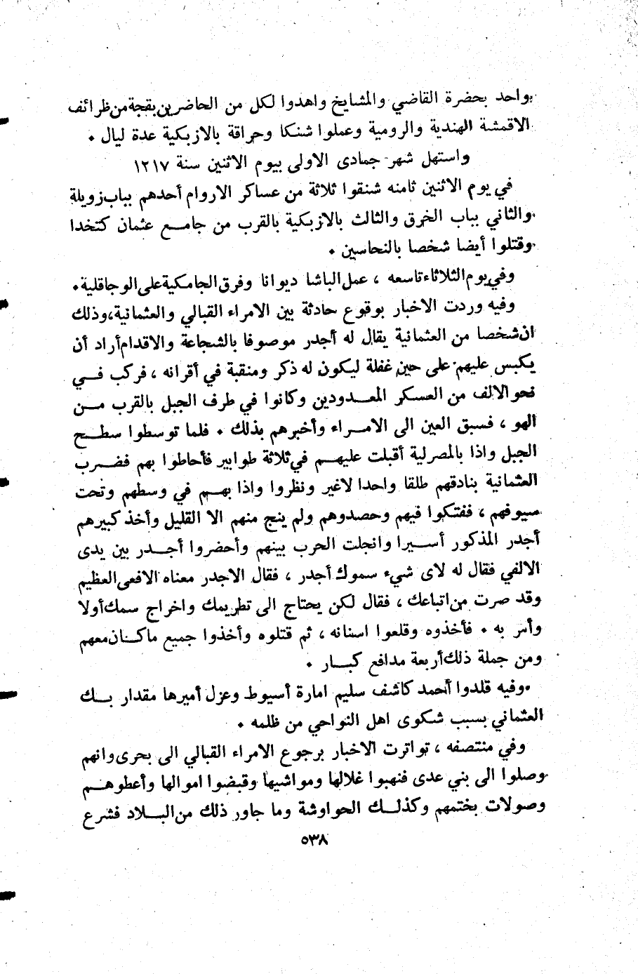 وفيه وردت الأخبار بوقوع حادثة بين الأمراء القبالي والعثمانية وذلك أن شخصا من العثمانية يقال له أجدر موصوفا بالشجاعة والاقدام أراد أن يكبس عليهم على حين غفلة ليكون له ذكر ومنقبة في أقرانه فركب في نحو الألف من العسكر المعدودين وكانوا في طرف الجبل بالقرب من الهو فسبق العين إلى الأمراء وأخبرهم بذلك فلما توسطوا سطح الجبل وإذا بالمصرلية أقبلت عليهم في ثلاثة طوابير فأحاطوا بهم فضرب العثمانية بنادقهم طلقا واحدا لا غير ونظروا وإذا بهم في وسطهم وتحت سيوفهم ففتكوا فيهم وحصدوهم ولم ينج منهم إلا القليل وأخذ كبيرهم أجدر المذكور أسيرا وانجلت الحرب بينهم وأحضروا أجدر بين يدي الألفي فقال له لاي شيء سموك أجدر فقال الاجدر معناه الافعى العظيم وقد صرت من اتباعك فقال لكن يحتاج إلى تطريمك واخراج سمك أولا وأمر به فأخذوه وقلعوا اسنانه ثم قتلوه وأخذوا جميع ما كان معهم ومن جملة ذلك أربعة مدافع كبار.
