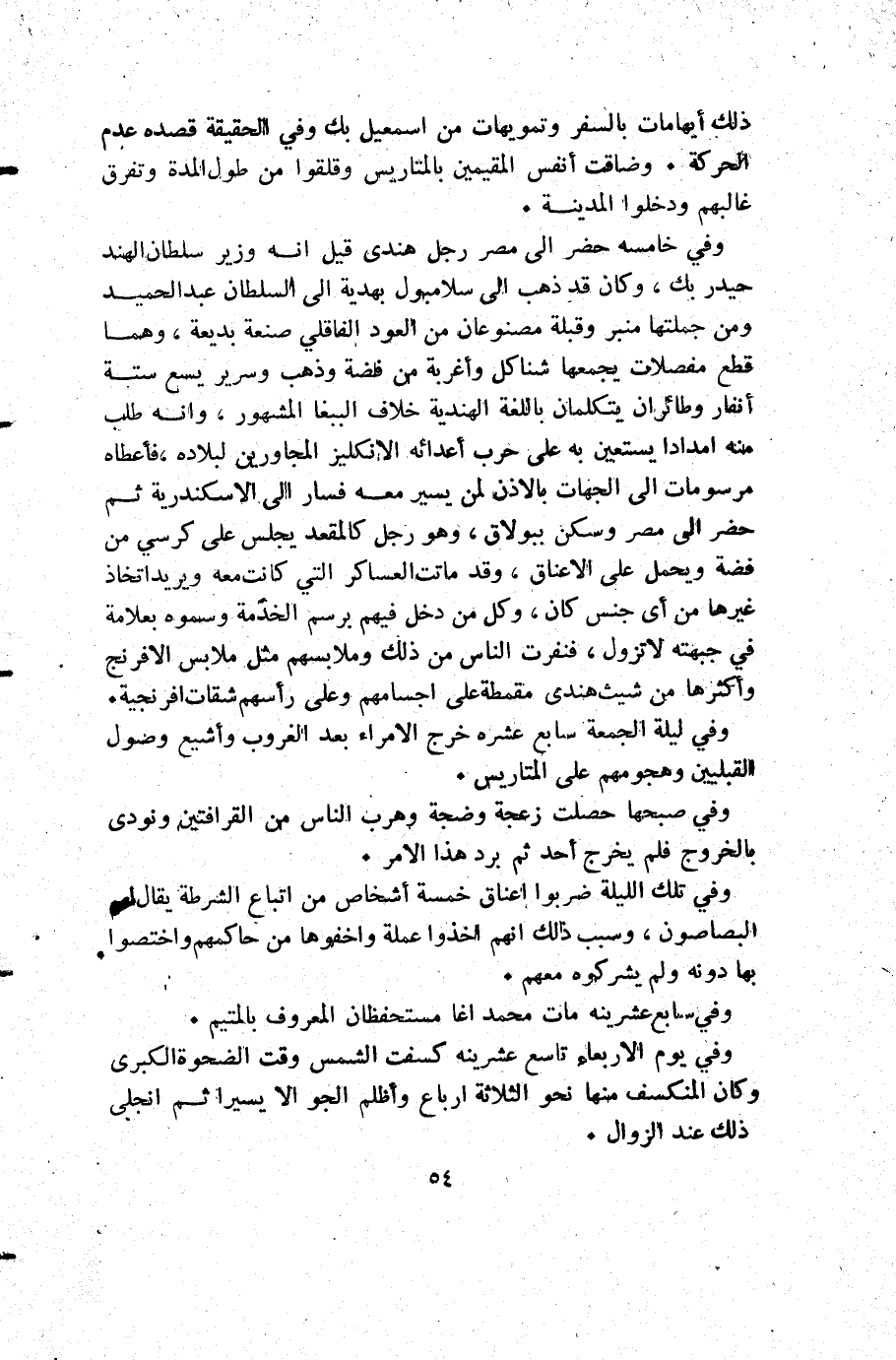 وفي خامسه حضر إلى مصر رجل هندي قيل أنه وزير سلطان الهند حيدر بك وكان قد ذهب إلى اسلامبول بهدية إلى السلطان عبد الحميد ومن جملتها منبر وقبلة مصنوعان من العود الفاقلي صنعة بديعة وهما قطع مفصلات يجمعها شناكل وأغربة من فضة وذهب وسرير يسع ستة انفار وطائران يتكلمان باللغة الهندية خلاف الببغا المشهور وأنه طلب منه امداد يستعين على حرب أعدائه الانكليز المجاورين لبلاده فأعطاه مرسومات إلى الجهات بالأذن لمن يسير معه فسار إلى الأسكندرية ثم حضر إلى مصر وسكن ببولاق وهو رجل كالمقعد يجلس على كرسي من فضة ويحمل على الأعناق وقد مات العساكر التي كانت معه ويريد اتخاذ غيرها من أي جنس كان وكل من دخل فيهم برسم الخدمة وسموه بعلامة في جبهته لا تزول فنفرت الناس من ذلك وملابسهم مثل ملابس الافرنج وأكثرها من شيث هندي مقمطة على أجسامهم وعلى رأسهم شقات افرنجية.