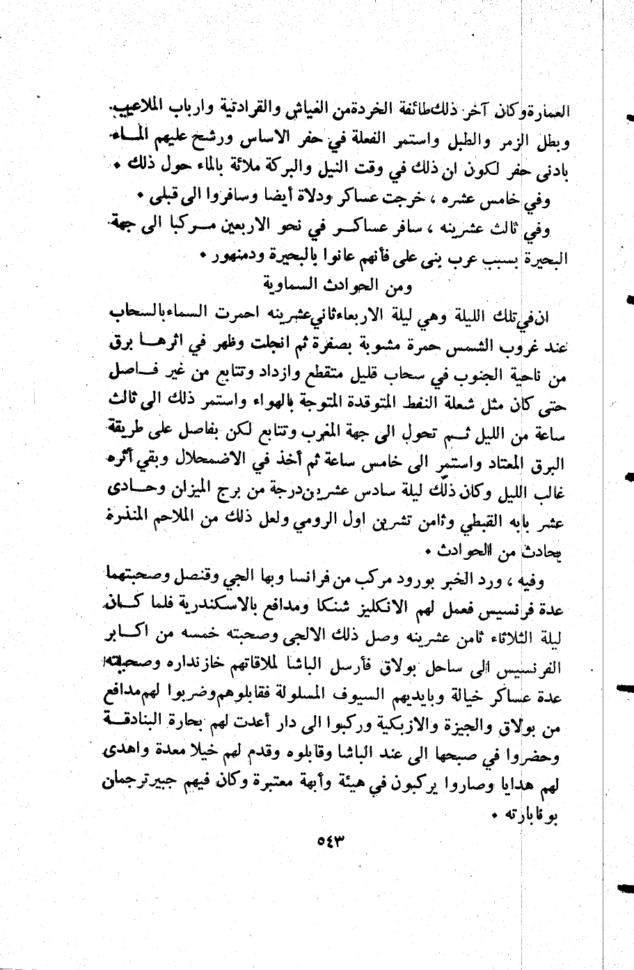 وفيه ورد الخبر بورود مركب من فرانسا وبها الجي وقنصل وصحبتهما عدة فرنسيس فعمل لهم الانكليز شنكا ومدافع بالاسكندرية فلما كان ليلة الثلاثاء ثامن عشرينه وصل ذلك الالجي وصحبته خمسة من أكابر الفرنسيس إلى ساحل بولاق فأرسل الباشا لملاقاتهم خازنداره وصحبته عدة عساكر خيالة وبأيديهم السيوف المسلولة فقابلوهم وضربوا لهم مدافع من بولاق والجيزة والازبكية وركبوا إلى دار أعدت لهم بحارة البنادقة وحضروا في صبحها إلى عند الباشا وقابلوه وقدم لهم خيلا معدة واهدى لهم هدايا وصاروا يركبون في هيئة وأبهة معتبرة وكان فيهم جبير ترجمان بونابارته