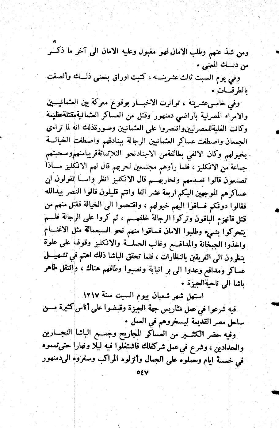 وفي خامس عشرينه تواترت الأخبار بوقوع معركة بين العثمانيين والأمراء المصرلية بأراضي دمنهور وقتل من العساكر العثمانية مقتلة عظيمة وكانت الغلبة للمصرليين وانتصروا على العثمانيين وصورة ذلك أنه لما تراءى الجمعان واصطفت عساكر العثمانيين الرجالة ببنادقهم واصطفت الخيالة بخيولهم وكان الألفي بطائفة من الأجناد نحو الثلاثمائة قريبا منهم وصحبتهم جماعة من الانكليز فلما رأوهم مجتمعين لحربهم قال لهم الانكليز ماذا تصنعون قالوا نصدمهم ونحاربهم قال الانكليز انظر وأما تقولون أن عساكرهم الموجهين اليكم أربعة عشر الفا وانتم قليلون قالواالنصر بيد الله فقالوا دونكم فساقوا إليهم خيولهم واقتحموا إلى الخيالة فقتل منهم من قتل فأنهزم الباقون وتركوا الرجالة خلفهم ثم كروا على الرجالة فلم يتحركوا بشيء وطلبوا الأمان فساقوا منهم نحو السبعمائة مثل الأغنام وأخذوا الجبخانة والمدافع وغالب الحملة والانكليز وقوف على علة ينظرون إلى الفريقين بالنظارات فلما تحقق الباشا ذلك اهتم في تشهيل عساكر ومدافع وعدوا إلى بر انبابة ونصبوا وطاقهم هناك وانتقل ظاهر باشا إلى ناحية الجيزة.