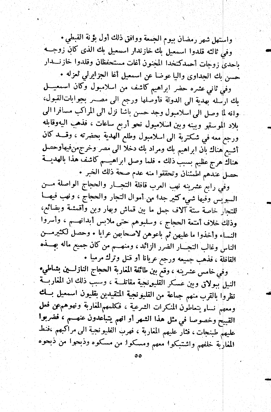 وفي رابع عشرينه نهب العرب قافلة التجار والحجاج الواصلة من السويس وفيها شيء كثير جدا من أموال التجار والحجاج ونهب فيها للتجار خاصة ستة آلاف جمل ما بين قماش وبهار وبن وأقمشة وبضائع وذلك خلاف أمتعة الحجاج وسلبوهم حتى ملابس أبدانهم وأسروا النساء وأخذوا ما عليهن ثم باعوهن لآصحابهن عرايا وحصل لكثير من الناس وغالب التجار الضرر الزائد ومنهم من كان جميع ماله بهذه القافلة فذهب جميعه ورجع عريانا أو قتل وترك مرميا.