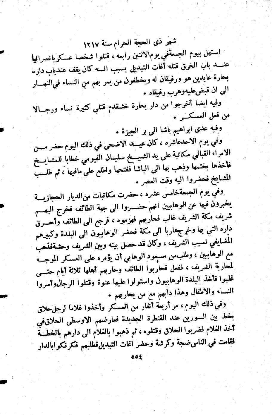 وفي يوم الجمعة خامس عشره حضرت مكاتبات من الديار الحجازية يخبرون فيها عن الوهابيين أنهم حضروا إلى جهة الطائف فخرج إليهم شريف مكة الشريف غالب فحاربهم فهزموه فرجع إلى الطائف وأحرق داره التي بها وخرج هاربا إلى مكة فحضر الوهابيون إلى البلدة وكبيرهم المضايفي نسيب الشريف وكان قد حصل بينه وبين الشريف وحشة فذهب مع الوهابيين وطلب من مسعود الوهابي أن يؤمره على العسكر الموجه لمحاربة الشريف ففعل فحاربوا الطائف وحاربهم أهلها ثلاثة أيام حتى غلبوا فأخذ البلدة الوهابيون واستولوا عليها عنوة وقتلوا الرجال وأسروا النساء والاطفال وهذا دأبهم مع من يحاربهم.