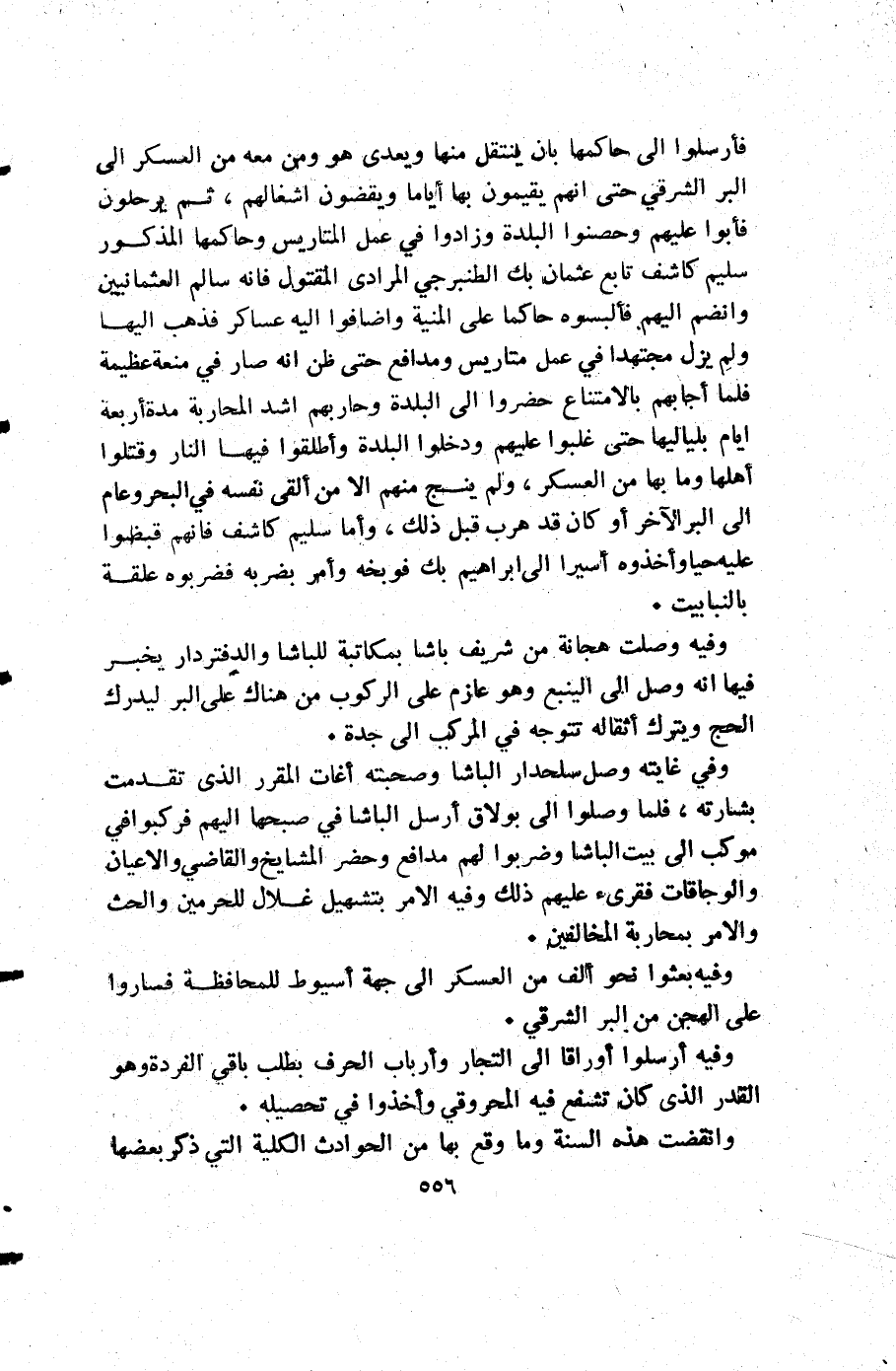 فأرسلوا إلى حاكمها بأن ينتقل منها ويعدى هو ومن معه من العسكر إلى البر الشرقي حتى أنهم يقيمون بها أياما ويقضون اشغالهم ثم يرحلون فأبوا عليهم وحصنوا البلدة وزادوا في عمل المتاريس وحاكمها المذكور سليم كاشف تابع عثمان بك الطنبرجي المرادي المقتول فإنه سالم العثمانيين وانضم إليهم فألبسوه حاكما على المنية واضافوا إليه عساكر فذهب إليها ولم يزل مجتهدا في عمل متاريس ومدافع حتى ظن أنه صار في منعة عظيمة فلما أجابهم بالامتناع حضروا إلى البلدة وحاربهم اشد المحاربة مدة أربعة أيام بلياليها حتى غلبوا عليهم ودخلوا البلدة وأطلقوا فيها النار وقتلوا أهلها وما بها من العسكر ولم ينج منهم إلا من ألقى نفسه في البحر وعام إلى البر الآخر أو كان قد هرب قبل ذلك وأما سليم كاشف فإنهم قبضوا عليه حيا وأخذوه أسيرا إلى إبراهيم بك فوبخه وأمر بضربه فضربوه علقة بالنبابيت.
