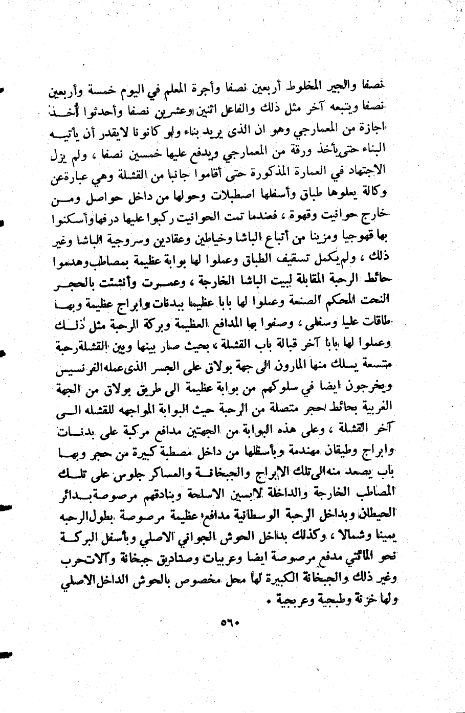 نصفا والجير المخلوط أربعين نصفا واجرة المعلم في اليوم خمسة وأربعين نصفا ويتبعه آخر مثل ذلك والفاعل اثنين وعشرين نصفا وأحدثوا أخذ إجازة من المعمارجي وهو أن الذي يريد بناء ولو كانونا لا يقدر أن يأتيه البناء حتى يأخذ ورقة من المعمارجي ويدفع عليها خمسين نصفا ولم يزل الاجتهاد في العمارة المذكورة حتى أقاموا جانبا من القشلة وهي عبارة عن وكالة يعلوها طباق وأسفلها اصطبلات وحولها من داخل حواصل ومن خارج حوانيت وقهوة فعندما تمت الحوانيت ركبوا عليها درفها وأسكنوا بها قهوجيا ومزينا من أتباع الباشا وخياطين وعقادين وسروجية الباشا وغير ذلك ولم يكمل تسقيف الطباق وعملوا لها بوابة عظيمة بمصاطب وهدموا حائط الرحبة المقابلة لبيت الباش الخارجة وعمرت وانشئت بالحجر النحت المحكم الصنعة وعملوا لها بابا عظيما ببدنات وابراج عظيمة وبها طاقات عليا وسفلى وصفوا بها المدافع العظيمة وبركة الرحبة مثل ذلك وعملوا لها باب آخر قبالة باب القشلة بحيث صار بينها وبين القشلة رحبة متسعة يسلك منها المارون إلى جهة بولاق على الجسر الذي عمله الفرنسيس ويخرجون أيضا في سلوكهم من بوابة عظيمة إلى طريق بولاق من الجهة الغربية بحائط حجر متصلة من الحربة حيث البوابة المواجهة للقشلة إلى آخر القشلة وعلى هذه البوابة من الجهتين مدافع مركبة على بدنات وابراج وطيقان مهندمة وبأسفلها من داخل مصطبة كبيرة من حجر وبها باب يصعد منه إلى تلك الأبراج والجبخانة والعساكر جلوس على تلك المصاطب الخارجة والداخلة لابسين الأسلحة وبنادقهم مرصوصة بدائر الحيطان وبداخل الرحبة الوسطانية مدافع عظيمة مرصوصة بطول الرحبة يمينا وشمالا وكذلك بداخل الحوش الجواني الأصلي وبأسفل البركة نحو المائتي مدفع مرصوصة أيضا وعربيات وصناديق جبخانة وآلات حرب وغير ذلك والجبخانة الكبيرة لها محل مخصوص بالحوش الداخل الأصلي ولها خزنة وطبجية وعربجية