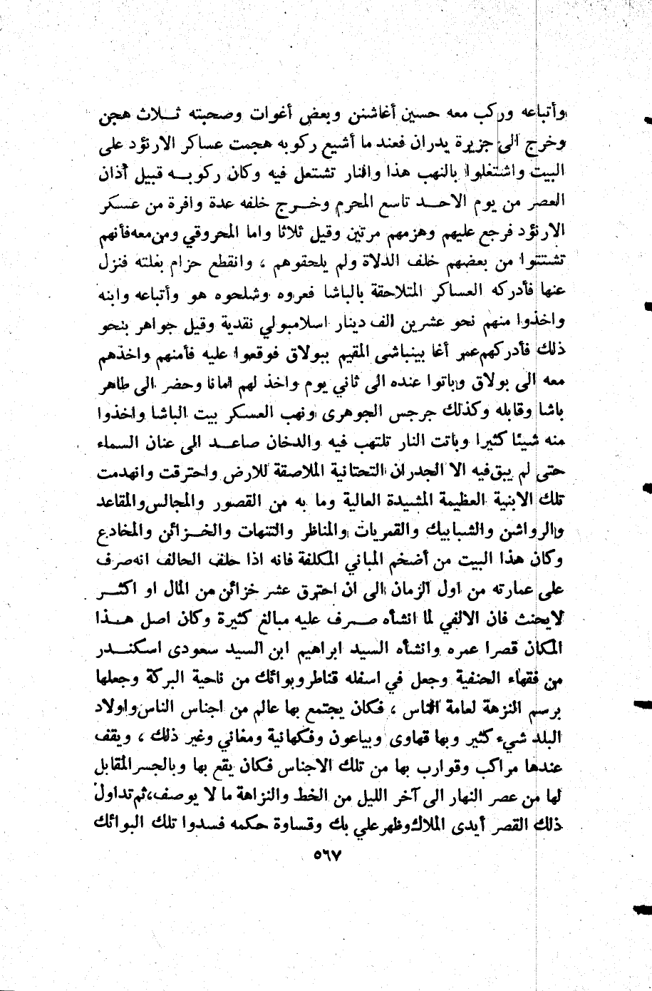 وأتباعه وركب معه حسين آغاشنن وبعض آغوات وصحبته ثلاث هجن وخرج إلى جزيرة بدران فعندما أشيع ركوبه هجمت عساكر الارنؤد على البيت واشتغلوا بالنهب هذا والنار تشتعل فيه وكان ركوبه قبيل أذان العصر من يوم الأحد تاسع المحرم وخرج خلفه عدة وافرة من عسكر الارنؤد فرجع عليهم وهزمهم مرتين وقيل ثلاثا وأما المحروقي ومن معه فإنهم تشتتوا من بعضهم خلف الدلاة ولم يلحقوهم وانقطع حزام بغلته فنزل عنها فأدركه العساكر المتلاحقة بالباشا فعروه وشلحوه هو واتباعه وابنه وأخذوا منهم نحو عشرين ألف دينار اسلامبولي نقدية وقيل جواهر بنحو ذلك فأدركهم عمر أغا بينباشي المقيم ببولاق فوقعوا عليه فأمنهم واخذهم معه إلى بولاق وباتوا عنده إلى ثاني يوم وأخذ لهم أمانا وحضر إلى طاهر باشا وقابله وكذلك جرجس الجوهري ونهب العسكر بيت الباشا وأخذوا منه شيئا كثيرا وباتت النار تلتهب فيه والدخان صاعد إلى عنان السماء حتى لم يبق فيه إلا الجدران التحتانية الملاصقة للارض واحترقت وأنهدمت تلك الأبنية العظيمة المشيدة العالية وما به من القصور والمجالس والمقاعد والرواشن والشبابيك والقمريات والمناظر والتنهات والخزائن والمخادع وكان هذا البيت من أضخم المباني المكلفة فإنه إذا حلف الحألف أنه صرف على عمارته من أول الزمان إلى أن احترق عشر خزائن من المال أو أكثر لا يحنث فإن الألفي لما انشأه صرف عليه مبالغ كثيرة وكان اصل هذا المكان قصرا عمره وانشأه السيد إبراهيم ابن السيد سعودي اسكندر من فقهاء الحنفية وجعل في اسفله قناطر وبوائك من ناحية البركة وجعلها برسم النزهة لعامة الناس فكان يجتمع بها عالم من اجناس الناس وأولاد البلد شيء كثير وبها قهاوي وبياعون وفكهانية ومغاني وغير ذلك ويقف عندها مراكب وقوارب بها من تلك الاجناس فكان يقع بها وبالجسر المقابل لها من عصر النهار إلى آخر الليل من الخط والنزاهة ما لا يوصف ثم تداول ذلك القصر أيدي الملاك وظهر علي بك وقساوة حكمه فسدوا تلك البوائك