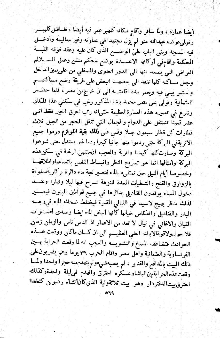 أيضا عمارة ولما سافر وأقام مكانه كلهبر عمر فيه أيضا فلما قتل كلهبر وتولى عوضه عبد الله منو لم يزل مجتهدا في عمارته وغير معاليمه وادخل فيه المسجد وبنى الباب على الوضع الذي كان عليه وعقد فوقه القبة المحكمة وأقام في أركانها الأعمدة بوضع محكم متقن وعمل السلالم العراض التي يصع منها إلى الدور العلوي والسفلي من على يمين الداخل وجعل مساكنه كلها تنفذ إلى بعضها البعض على طريقة وضع مساكنهم واستمر يبني فيه ويعمر مدة إقامته إلى أن خرج من مصر فلما حضر العثمانية وتولى على مصر محمد باشا المذكور رغب في سكنى هذا المكان وشرع في تعميره هذه العمارة العظيمة حتى أنه رتب لحرق الجير فقط اثني عشر قمينا تشتغل على الدوام والجمال التي تنقل الحجر من الجبل ثلاث قطارات كل قطار سبعون جملا وقس على ذلك بقية اللوازم ورموا جميع الأتربة في البركة حتى ردموا منها جانبا كبيرا ردما غير معتدل حتى شوهوا البركة وصارت كلها كيمانا واتربة والعجب أن منتهى الرغبة في سكن هذه البركة وأمثالها إنما هو تسريح النظر وانبساط النفس باتساعها واطلاقها وخصوصا أيام النيل حين تمتلىء بالماء فتصير لحة ماء دائرة بركارية مملوءة بالزوارق والقنج والشطيات المعدة للنزهة تسرح فيها ليلا ونهارا وعند دخول المساء يوقدون القناديل بدائرها في جميع قواطين البيوت فيصير لذلك منظر بهيج لا سيما في الليالي المقمرة فيختلط ضحك الماء في وجه البدر والقناديل وانعكاس خيالها كأنها أسفل الماء أيضا وصدى أصوات القيان والاغاني في ليال لا تعد من الأعمار إذ الناس ناس والزمان زمان فلا حول ولا قوة إلا بالله العلي العظيم إلى أن كان ما كان وقعت هذه الحوادث فتضاعف المسخ والتشويه والعجب أنه لما وقعت الحرابة بين الفرنساوية والعثمانية وأهل مصر وأقام الحرب 36 يوما وهم يضربون على ذلك بالبيت بالمدافع والقنابر لم يصبه شيء ولم ينهدم منه حجرا واحدا ولما وقعت هذه الحرابة بين الباشا وعسكره احترق وأنهدم في ليلة واحدة كذلك احترق بيت الدفتردار وهو بيت ثلاثة ولية الذي كان أنشأه رضوان كتخدا