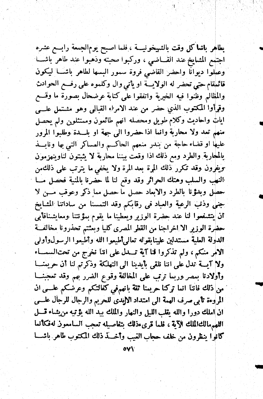 بطاهر باشا كل وقت بالشيخونية فلما أصبح يوم الجمعة رابع عشره اجتمع المشايخ عند القاضي وركبوا صحبته وذهبوا عند طاهر باشا وعملوا ديوانا وأحضر القاضي فروة سمور البسها لطاهر باشا ليكون قائمقام حتى تحضر له الولاية أو يأتي وال وكلموه على رفع الحوادث والمظالم وظنوا فيه الخيرية واتفقوا على كتابة عرضحال بصورة ما وقع وقرأوا المكتوب الذي حضر من عند الأمراء القبالى وهو مشتمل على آيات واحاديث وكلام طويل ومحصلة أنهم طائعون وممتثلون ولم يحصل منهم تعد ولا محاربة وإنما إذا حضروا إلى جهة أو بلدة وطلبوا المرور عليها أو قضاء حاجة من بندر منعهم الحاكم والعساكر التي بها ونابذ بالمحاربة والطرد ومع ذلك إذا وقعت بيننا محاربة لا يثبتون لنا وينهزمون ويفرون وقد تكرر ذلك المرة بعد المرة ولا يخفي ما يترتب على ذلك من النهب والسلب وهتك الحرائر وقد وقع لنا لما حضرنا بالمنية فحصل ما حصل وبدؤنا بالطرد والابعاد حصل ما حصل مما ذكر وعوقب من لا جنى وذنب الرعية والعباد في رقابكم وقد التمسنا من ساداتنا المشايخ أن يتشفعوا لنا عند حضرة الوزير ويعطينا ما يقوم بمؤنتنا ومعايشنا فأبى حضرة الوزير إلا أخراجنا من القطر المصري كليا وبعثتم تحذرونا مخالفة الدولة العلية مستدلين علينا بقوله تعالى: {وَأَطِيعُوا الرَّسُولَ وَأُولِي الْأَمْرِ مِنْكُمْ} ولم تذكروا لنا آية تدل على أننا نخرج من تحت السماء ولا آية تدل على أننا نلقي بأيدينا إلى التهلكة وذكرتم لنا أن حريمنا وأولادنا بمصر ربما ترتب على المخالفة وقوع الضرر بهم وقد تعجبنا من ذلك فإننا إنما تركنا حريمنا ثقة بأنهم في كفالتكم وعرضكم على أن المروءة تابى صرف الهمة إلى امتداد الأيدي للحريم والرجال للرجال على أن املك دورا والله يقلب الليل والنهار والملك بيد الله يؤتيه من يشاء قل: اللهم مالك الملك الاية فلما قرىء ذلك بتفاصيله تعجب السامعون له فكأنما كانوا ينظرون من خلف حجاب الغيب وأخذ ذلك المكتوب طاهر باشا