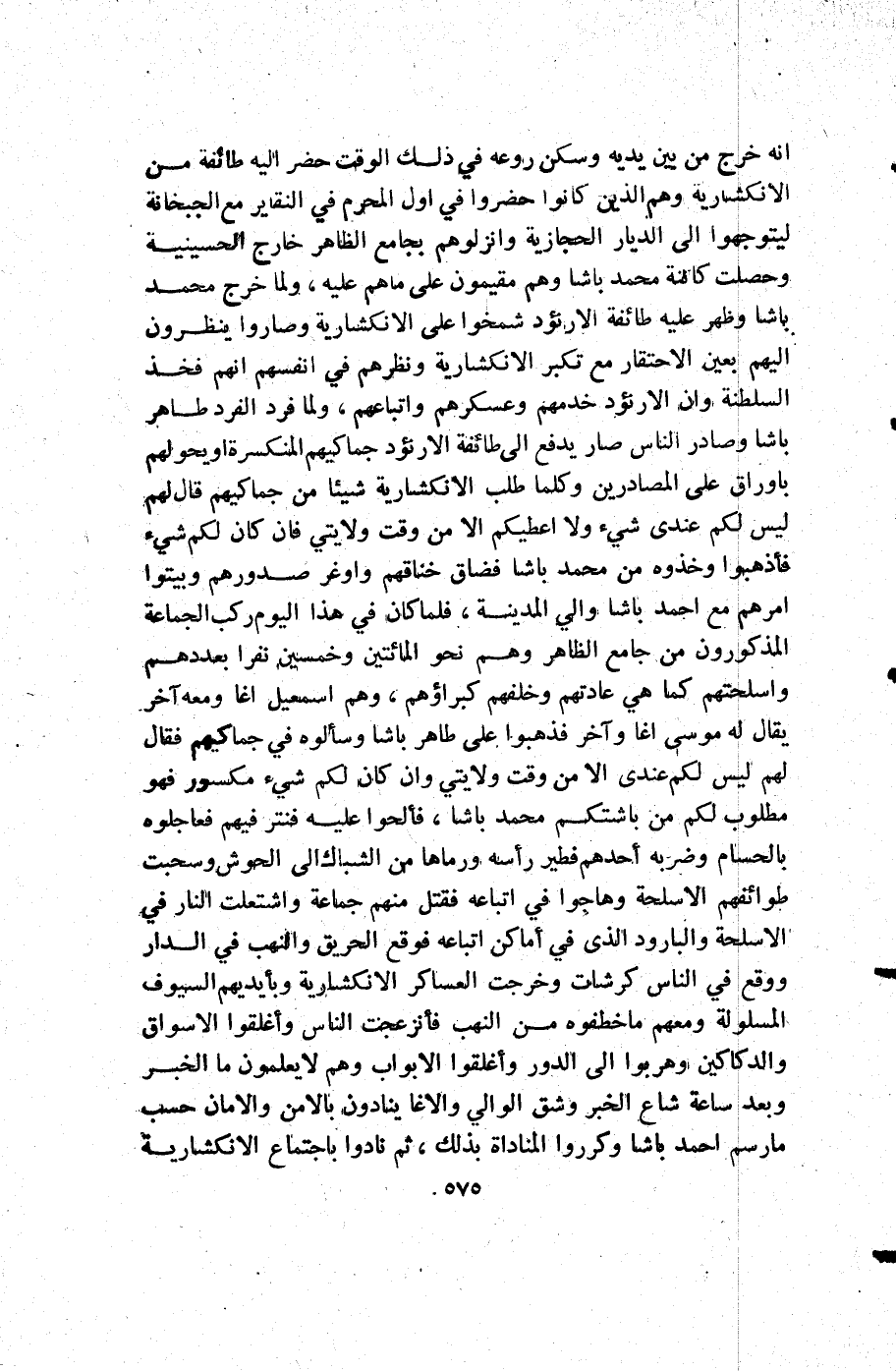 انه خرج من بين يديه وسكن روعه في ذلك الوقت حضر إليه طائفة من الانكشارية وهم الذين كانوا حضروا في أول المحرم في النقاير مع الجبخانة ليتوجهوا إلى الديار الحجازية وأنزلوهم بجامع الظاهر خارج الحسينية وحصلت كائنة محمد باشا وهم مقيمون على ما هم عليه ولما خرج محمد باشا وظهر عليه طائفة الارنؤد شمخوا على الانكشارية وصاروا ينظرون إليهم بعين الاحتقار مع تكبر الانكشارية ونظرهم في أنفسهم أنهم فخذ السلطنة وأن الارنؤد خدمهم وعسكرهم واتباعهم ولما فرد الفرد طاهر باشا وصادر الناس صار يدفع إلى طائفة الارنؤد جماكيهم المنكسرة أو يحولهم بارواق على المصادرين وكلما طلب الانكشارية شيئا من جماكيهم قال لهم ليس لكم عندي شيء ولا اعطيكم إلا من وقت ولايتي فإن كان لكم شيء فأذهبوا وخذوه من محمد باشا فضاق خناقهم واوغر صدورهم وبيتوا أمرهم مع أحمد باشا والي المدينة فلما كان في هذا اليوم ركب الجماعة المذكورون من جامع الظاهر وهم نحو المائتين وخمسين نفرا بعددهم واسلحتهم كما هي عادتهم وخلفهم كبراؤهم وهم إسمعيل اغا ومعه آخر يقال له موسى اغا وآخر فذهبوا على طاهر باشا وسألوه في جماكيهم فقال لهم: ليس لكم عندي إلا من وقت ولايتي وأن أن لكم شيء مكسور فهو مطلوب لكم من باشتكم محمد باشا فألحوا عليه فنتر فيهم فعاجلوه بالحسام وضربه أحدهم فطير رأسه ورماها من الشباك إلى الحوش وسحبت طوائفهم الأسلحة وهاجوا في اتباعه فقتل منهم جماعة واشتعلت النار في الأسلحة والبارود الذي في أماكن اتباعه فوقع الحريق والنهب في الدار ووقع في لناس كرشات وخرجت العساكر الانكشارية وبايديهم السيوف المسلولة ومعهم ما خطفوه من النهب فأنزعجت الناس وأغلقوا الأسواق والدكاكين وهربوا إلى الدور وأغلقوا الأبواب وهم لا يعلمون ما الخبر وبعد ساعة شاع الخبر وشق الوالي والاغا ينادون بالأمن والأمان حسب مارسم أحمد باشا وكرروا المناداة بذلك ثم نادوا باجتماع الانكشارية