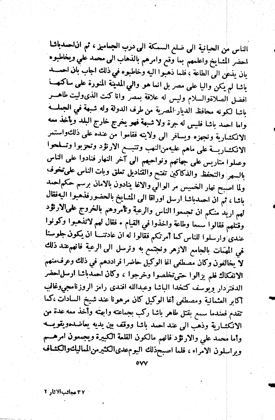 الناس من الحبانية إلى ضلع السمكة إلى درب الجماميز ثم أن أحمد باشا أحضر المشايخ وأعلمهم بما وقع وأمرهم بالذهاب إلى محمد علي ويخاطبوه بأن يذعن إلى الطاعة فلما ذهبوا إليه وخاطبوه في ذلك أجاب بأن أحمد باشا لم يكن واليا على مصر بل إنما هو والي المدينة المنورة على ساكنها افضل الصلاة والسلام وليس له علاقة بمصر وأنا كنت الذي وليت طاهر باشا لكونه محافظ الديار المصرية من طرف الدولة وله شبهة في الجملة وأما أحمد باشا فليس له جرة ولا شبهة فهو يخرج خارج البلد ويأخذ معه الانكشارية ونجهزه ويسافر إلى ولايته فقاموا من عنده على ذلك واستمر الانكشارية على ما هم عليه من النهب وتتبع الارنؤد وتحزيوا وتسلحوا وعملوا متاريس على جهاتهم ونواحيهم إلى آخر النهار فنادوا على الناس بالسهر والتحفظ والدكاكين تفتح والقناديل تعلق وبات الناس على تحوف ولما أصبح نهار الخميس مر الوالي والاغا ينادون بالأمان برسم حكم أحمد باشا ثم أن أحمد باشا أرسل أوراقا إلى المشايخ بالحضور فذهبوا إليه فقال لهم اريد منكم أن تجمعوا الناس والرعية وتأمروهم بالخروج على الارنؤد وقتلهم فقالوا سمعا وطاعة وأخذوا في القيام فقال لهم لا تذهبوا وكونوا عندي وأرسلوا للناس كما أمرتكم فقالوا له أن عادتنا أن يكون جلوسنا في المهمات بالجامع الأزهر ونجتمع به ونرسل إلى الرعية فإنهم عند ذلك لا يخالفون وكان مصطفى اغا الوكيل حاضرا فراددهم في ذلك وعرف منهم الانفكاك فلم يزالوا حتى تخلصوا وخرجوا وكان أحمد باشا أرسل أحضر الدفتردار ويوسف كتخدا الباشا وعبد الله أفندي رامز الروزنامجي وغالب أكابر العثمانية ومصطفى أغا الوكيل كان مرهونا عند شيخ السادات كما تقدم فعندما سمع بقتل طاهر باشا ركب بجماعته وابهته وأخذ معه عدة من الانكشارية وذهب إلى عند أحمد باشا ووقف بين يديه يعاضده ويقويه وأما محمد علي والأنؤد فإنهم مالكون القلعة الكبيرة ويجمعون أمرهم ويراسلون الأمراء فلما أصبح ذلك اليوم عدى الكثير من المماليك والكشاف