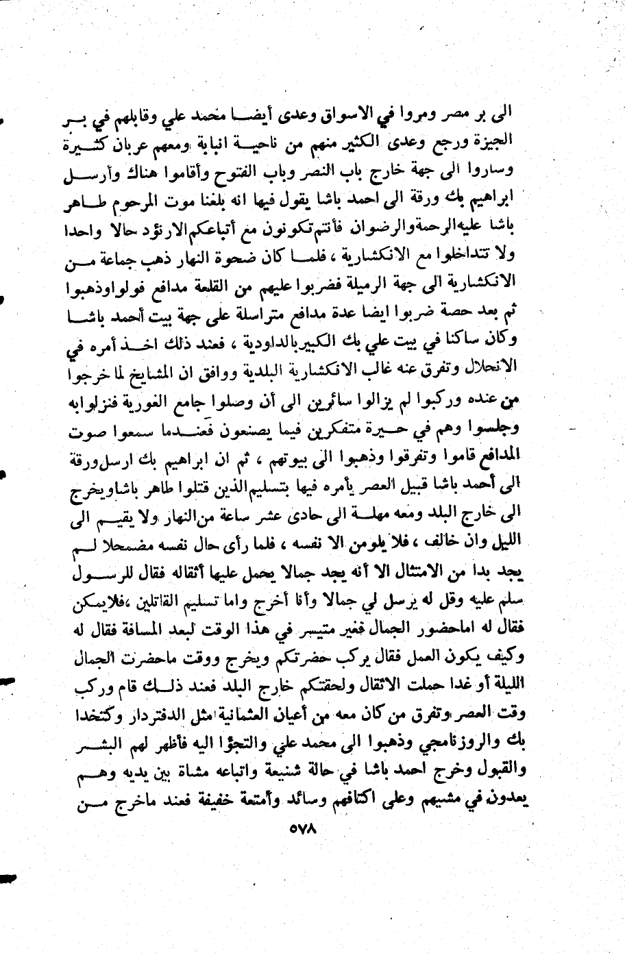 الى بر مصر ومروا في الأسواق وعدى أيضا محمد علي وقابلهم في بر الجيزة ورجع وعدى الكثير منهم من ناحية انبابة ومعهم عربان كثيرة وساروا إلى جهة خارج باب النصر وباب الفتوح وأقاموا هناك وأرسل إبراهيم بك ورقة إلى أحمد باشا يقول فيها أنه بلغنا موت المرحوم طاهر باشا عليه الرحمة والرضوان فأنتم تكونون مع أتباعكم الارنؤد حالا واحدا ولا تتداخلوا مع الانكشارية فلما كان ضحوة النهار ذهب جماعة من الانكشارية إلى جهة الرميلة فضربوا عليهم من القلعة مدافع فولوا وذهبوا ثم بعد حصة ضربوا أيضا عدة مدافع متراسلة على جهة بيت أحمد باشا وكان ساكنا في بيت علي بك الكبير بالداودية فعند ذلك أخذ أمره في الانحلال وتفرق عنه غالب الانكشارية البلدية ووافق أن المشايخ لما خرجوا من عنده وركبوا لم يزالوا سائرين إلى أن وصلوا جامع الغورية فنزلوا به وجلسوا وهم في حيرة متفكرين فيما يصنعون فعندما سمعوا صوت المدافع قاموا وتفرقوا وذهبوا إلى بيوتهم ثم أن إبراهيم بك أرسل ورقة إلى أحمد باشا قبيل العصر يأمره فيها بتسليم الذين قتلوا طاهر باشا ويخرج إلى خارج البلد ومعه مهلة إلى حادي عشر ساعة من النهار ولا يقيم إلى الليل وأن خألف فلا يلومن إلا نفسه فلما رأى حال نفسه مضمحلا لم يجد بدا من الأمتثال إلا أنه لم يجد جمالا يحمل عليها أثقاله فقال للرسول سلم عليه: وقل له: يرسل لي جمالا وأنا أخرج وأما تسليم القاتلين فلا يمكن فقال له أما حضور الجمال فغير متيسر في هذا الوقت لبعد المسافة فقال له: وكيف يكون العمل فقال: يركب حضرتكم ويخرج ووقت ما حضرت الجمال الليلة أو غدا حملت الاثقال ولحقتكم خارج البلد فعند ذلك قام وركب وقت العصر وتفرق من كان معه من أعيان العثمانية مثل الدفتردار وكتخدا بك والروزنامجي وذهبوا إلى محمد علي والتجؤا إليه فأظهر لهم البشر والقبول وخرج أحمد باشا في حالة شنيعة واتباعه مشاة بين يديه وهم يعدون في مشيهم وعلى اكتافهم وسائد وأمتعة خفيفة فعند ما خرج من