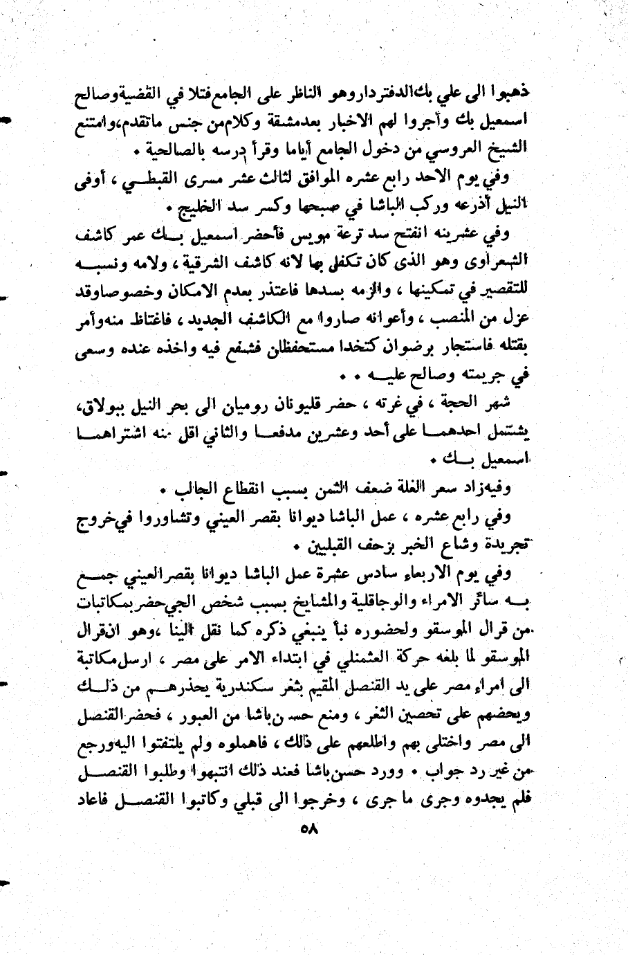 ذهبوا إلى علي بك الدفتردار وهو الناظر على الجامع فتلا في القضية وصالح إسمعيل بك واجروا لهم الأخبار بعد مشقة وكلام من جنس ماتقدم وامتنع الشيخ العروسي من دخول الجامع أياما وقرأ درسه بالصالحية.