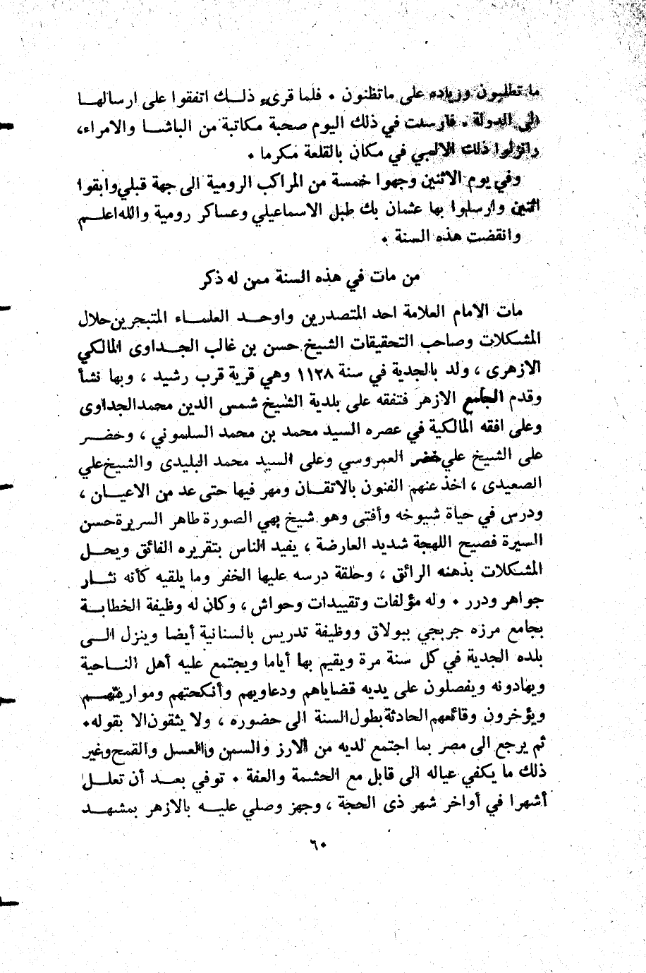 مات الإمام العلامة أجد المتصدرين واوحد العلماء المتبحرين حلال المشكلات وصاحب التحقيقات الشيخ حسن بن غالب الجداوي المالكي الأزهري ولد بالجدية في سنة 1128 وهي قرية قرب رشيد وبها نشأ وقدم الجامع الأزهر فتفقه على بلدية الشيخ شمس الدين محمد الجداوي وعلى افقه المالكية في عصره السيد محمد بن محمد السلموني وحضر على الشيخ علي خضر العمروسي وعلى السيد محمد البليدي والشيخ علي الصعيدي أخذ عنهم الفنون بالاتقان ومهر فيها حتى عد من الأعيان ودرس في حياة شيوخه وأفتى وهو شيخ بهي الصور طاهر السريرة حسن السيرة فصيح اللهجة شديد العارضة يفيد الناس بتقريره الفائق ويحل المشكلات بذهنه الرائق وحلقة درسه عليها الخفر وما يلقيه كأنه نثار جواهر ودرر وله مؤلفات وتقييدات وحواش وكان له وظيفة الخطابة بجامع مرزه جربجي ببولاق ووظيفة تدريس بالسنانية أيضا وينزل إلى بلده الجدية في كل سنة مرة ويقيم بها أياما ويجتمع عليه أهل الناحية ويهادونه ويفصلون على يديه قضاياهم ودعاويهم وأنكحتهم ومواريثهم ويؤخرون وقائعهم الحادثة بطول السنة إلى حضوره ولا يثقون إلا بقوله ثم يرجع إلى مصر بما اجتمع لديه من الارز والسمن والعسل والقمح وغير ذلك ما يكفي عياله إلى قابل مع الحشمة والعفة توفي بعد أن تعلل أشهرا في أواخر شهر ذي الحجة وجهز وصلي عليه بالأزهر بمشهد.