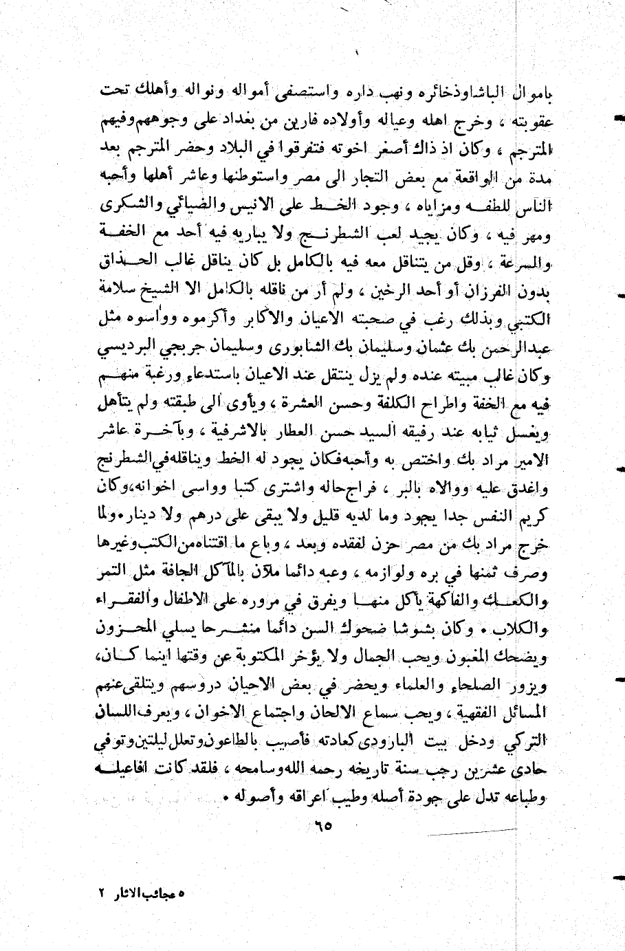 بأموال الباشا وذخائره ونهب داره واستصفى أمواله ونواله وأهلك تحت عقوبته وخرج أهله وعياله وأولاده فارين من بغداد على وجوهم وفيهم المترجم وكان إذ ذاك أصغر اخوته فتفرقوا في البلاد وحضر المترجم بعد مدة من الواقعة مع بعض التجار إلى مصر واستوطنها وعاشر أهلها وأحبه الناس للطفه ومزاياه وجود الخط على الانيس والضيائي والكشري ومهر فيه وكان يجيد لعب الشطرنج ولا يباريه فيه أجد مع الخفة والسرعة وقل من يتناقل معه فيه بالكامل بل كان يناقل غالب الحذاق بدون الفرزان أو أجد الرخين ولم أر من ناقلة بالكامل إلا الشيخ سلامة الكتبي وبذلك رغب في صحبته العيان والأكابر وأكرموه وواسوه مثل عبد الرحمن بك عثمان وسليمان بك الشابوري وسليمان جربجي البرديسي وكان غالب مبيته عنده ولم يزل ينتقل عند الأعيان باستدعاء ورغبة منهم فيه مع الخفة واطراح الكلفة وحسن العشرة ويأوي إلى طبقته ولم يتأهل ويغسل ثيابه عند رفيقه السيد حسن العطار بالاشرفية وبآخرة عاشر الأمير مراد بك واختص به وأحبه فكان يجود له الخط ويناقله في الشطرنج وأغدق عليه ووالاه بالبر فراج حاله واشترى كتبا وواسى اخوانه وكان كريم النفس جدا يجود وما لديه قليل ولا يبقى على درهم ولا دينار ولما خرج مراد بك من مصر حزن لفقده وبعد وباع ما اقتناه من الكتب وغيرها وصرف ثمنها في بره ولوازمه وعبه دائما ملآن بالمآكل الجافة مثل التمر والكعك والفاكهة يأكل منها ويفرق في مروره على الأطفال والفقراء والكلاب وكان بشوشا ضحوك السن دائما منشرحا يسلي المحزون ويضحك المغبون ويحب الجمال ولا يؤخر المكتوبة عن وقتها اينما كان ويزور الصلحاء والعلماء ويحضر في بعض الأحيان دروسهم ويتلقى عنهم المسائل الفقهية ويحب سماع الألحان واجتماع الإخوان ويعرف اللسان التركي ودخل بيت البارودي كعادته فأصيب بالطاعون وتعلل ليلتين وتوفي حادي عشرين رجب سنة تاريخه رحمه الله وسامحه فلقد كانت افاعيله وطباعه تدل على جودة أصله وطيب أعراقه وأصوله
