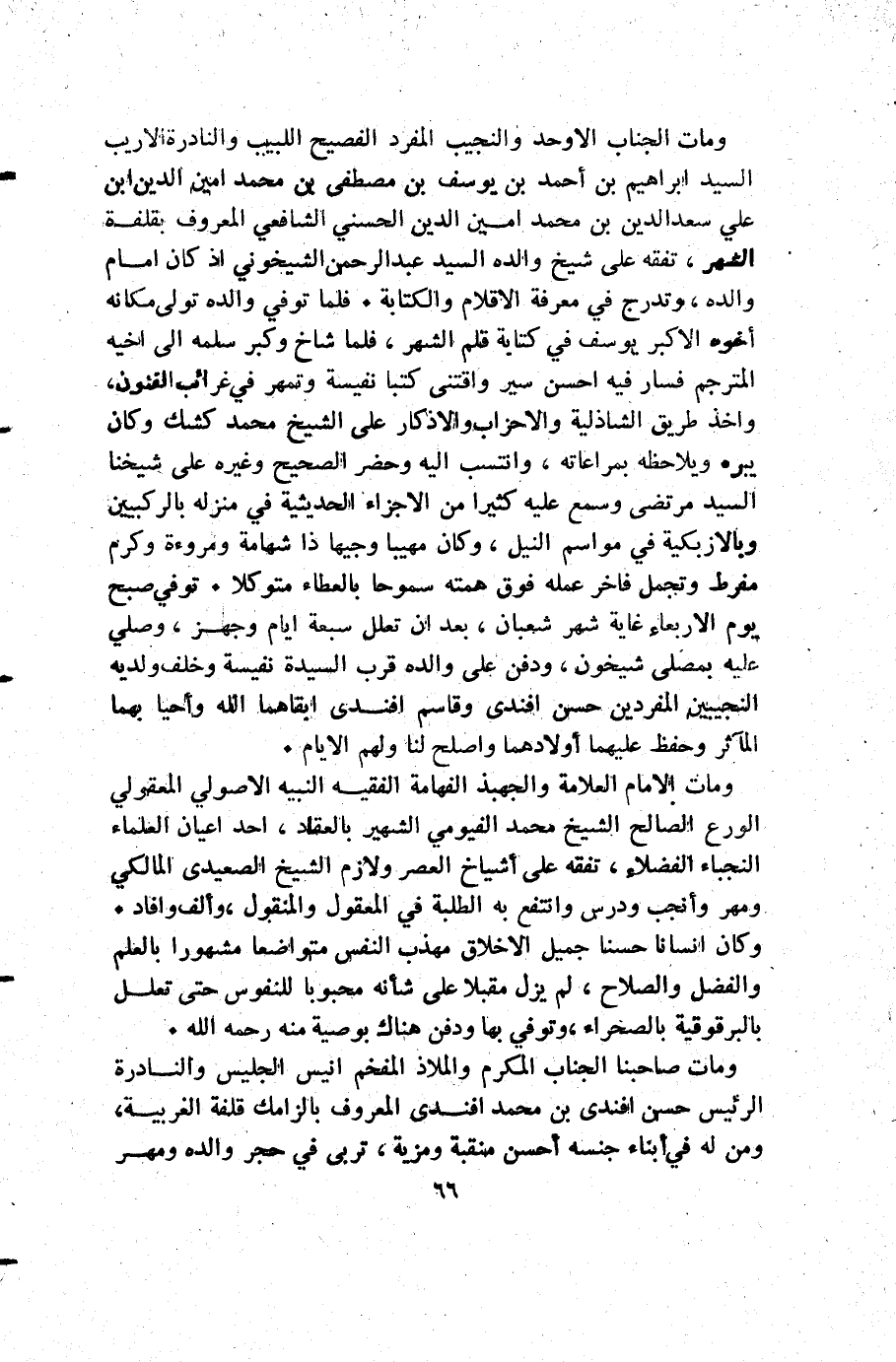ومات صاحبنا الجناب المكرم والملاذ المفخم أنيس الجليس والنادرة الرئيس حسن أفندي بن محمد أفندي المعروف بالزامك قلف الغربية ومن له في ابناء جنسه أحسن منقبة ومزية تربى في حجر والده ومهر