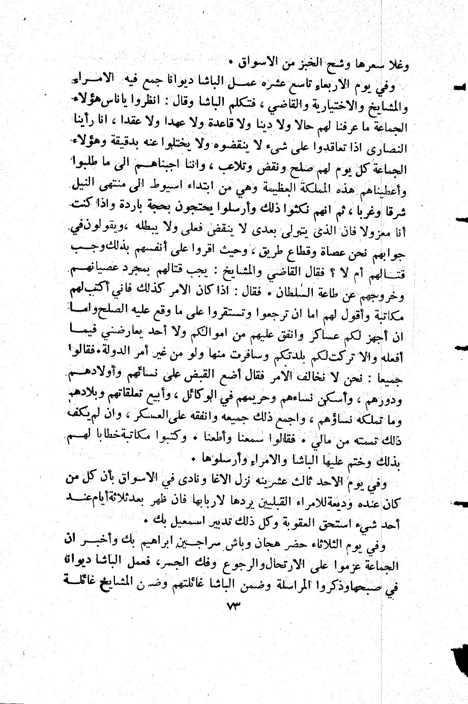 وفي يوم الأحد ثالث عشرينه نزل الاغا ونادى في الأسواق بأن كل من كان عنده وديعة للامراء القبليين يردها لاربابها فإن ظهر بعد ثلاثة أيام عند أجد شيء استحق العقوبة وكل ذلك تدبير إسمعيل بك.