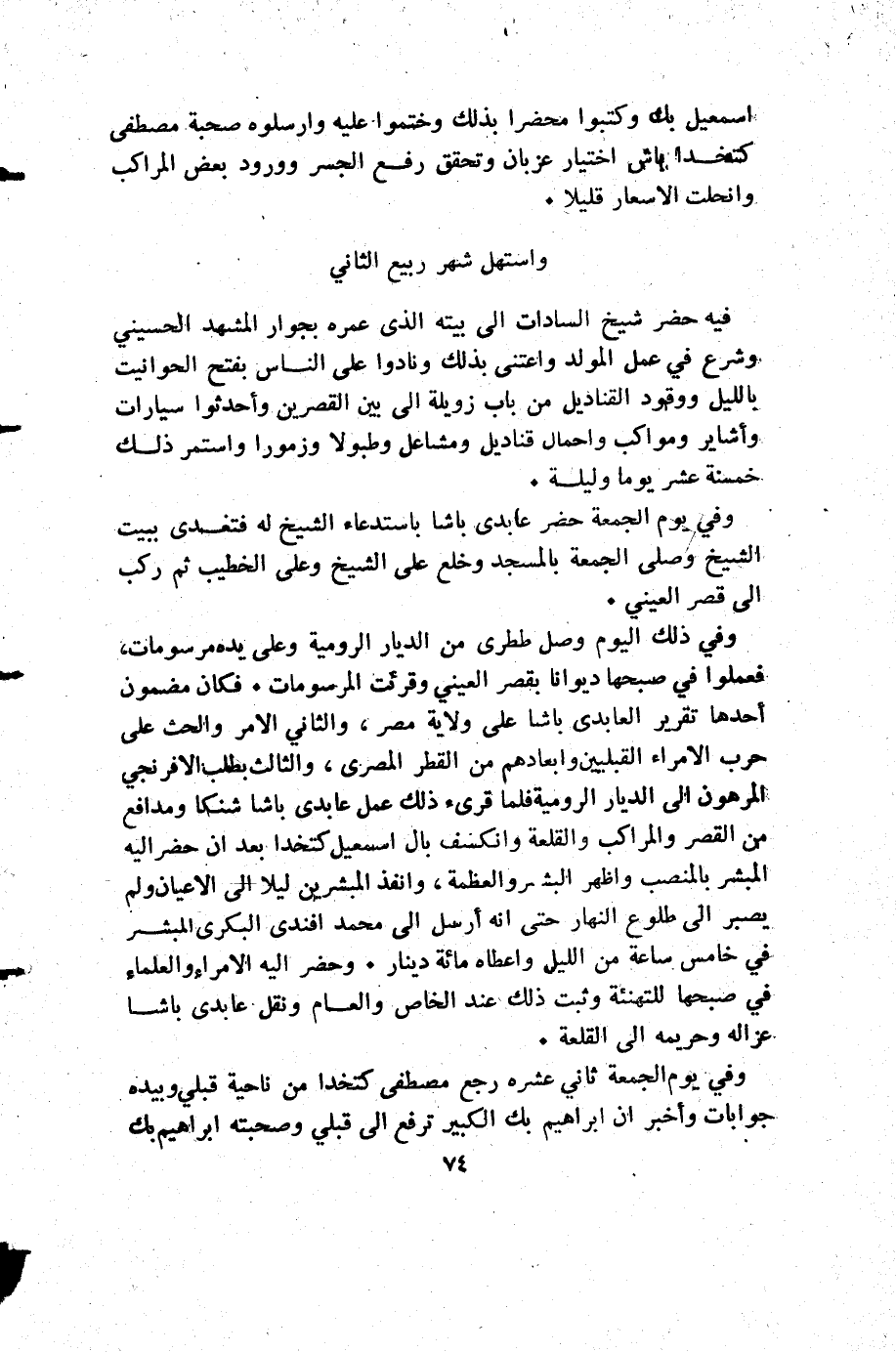وفي يوم الجمعة ثاني عشرة رجع مصطفى كتخدا من ناحية قبلي وبيده جوابات وأخبر أن إبراهيم بك الكبير ترفع إلى قبلي وصحبته إبراهيم بك