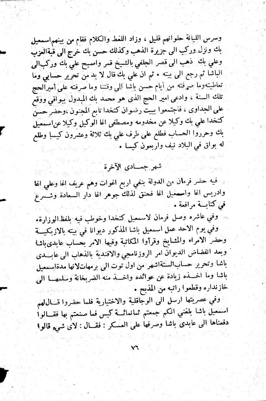 وفي عصريتها أرسل إلى الوجاقلية والاختيارية فلما حضروا قال لهم إسمعيل باشا: بلغني أنكم جمعتم ثمانمائة كيس فما صنعتم بها فقالوا: دفعناها إلى عابدي باشا وصرفها على العسكر فقال: لأي شيء قالوا:
