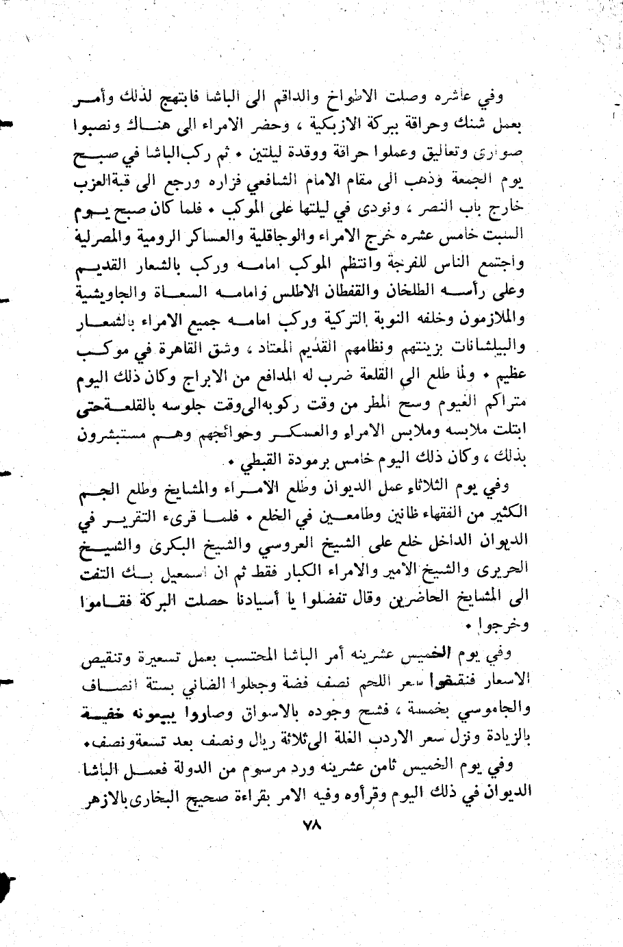 وفي يوم الخميس عشرينه أمر الباشا المحتسب بعمل تسعيرة وتنقيص الأسعار فنقضوا سعر اللحم نصفه فضة وجعلوا الضاني بستة انصاف والجاموسي بخمسة فشح وجوده بالأسواق وصاروا يبيعونه خفية بالزيادة ونزل سعر الاردب الغلة إلى ثلاثة ريال ونصف بعد تسعة ونصف.