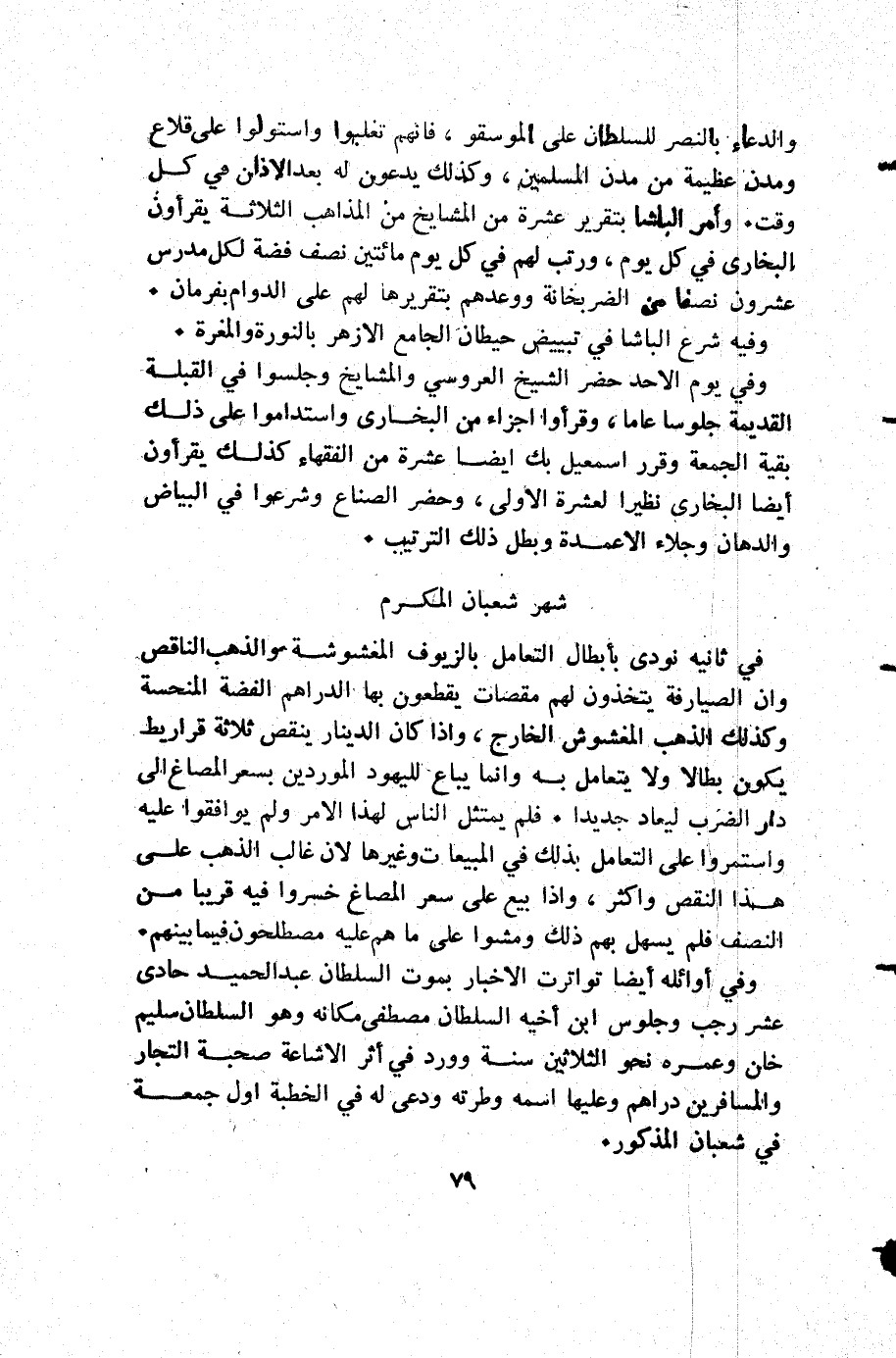 والدعاء بالنصر للسلطان على الموسقو فإنهم تغلبوا واستولوا على قلاع ومدن عظيمة من مدن المسلمين وكذلك يدعون له بعد الاذان في كل وقت وأمر الباشا بتقرير عشرة من المشايخ من المذاهب الثلاثة يقرأون البخاري في كل يوم ورتب لهم في كل يوم مائتين نصف فضة لكل مدرس عشرون نصفا من الضربخانة ووعدهم بتقريرها لهم على الدوام بفرمان.
