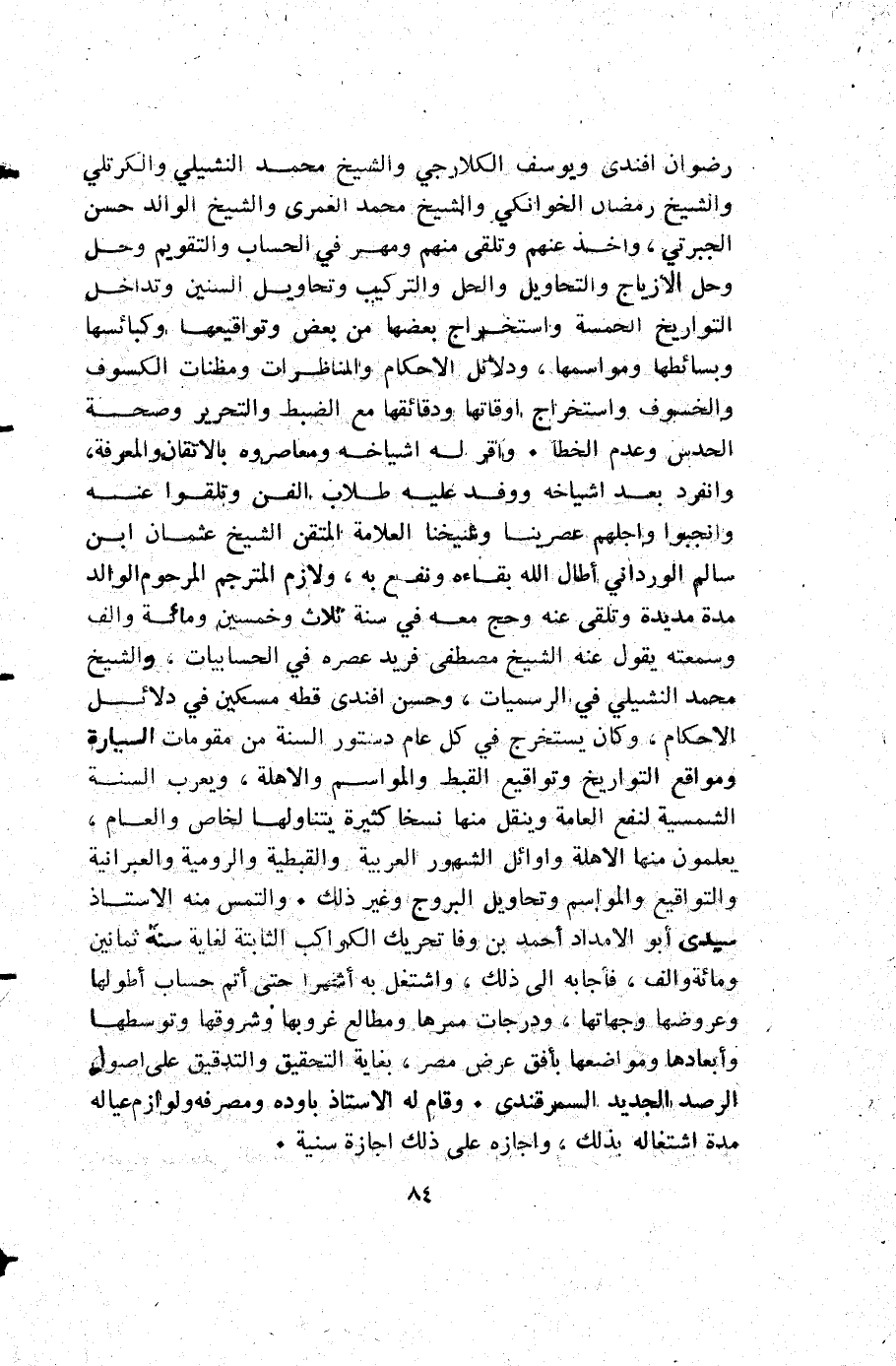 رضوان أفندي ويوسف الكلارجي والشيخ محمد النشيلي والكرتلي والشيخ رمضان الخوانكي والشيخ محمد الغمري والشيخ الوالد حسن الجبرتي وأخذ عنهم وتلقى منهم ومهر في الحساب والتقويم وحل الأزياج والتحاويل والحل والتركيب وتحاويل السنين وتداخل التواريخ الخمسة واستخراج بعضها من بعض وتواقيعها وكبائسها وبسائطها ومواسمها ودلائل الأحكام والمناظرات ومظنات الكسوف والخسوف واستخراج أوقاتها ودقائقها مع الضبط والتحرير وصحة الحدس وعدم الخطأ واقر له أشياخه ومعاصروه بالاتقان والمعرفة وانفرد بعد أشياخه ووفد عليه طلاب الفن وتلقوا عنه وانجبوا واجلهم عصرينا وشيخنا العلامة المتقن الشيخ عثمان ابن سالم الورداني اطال الله بقاءه ونفع به ولازم المترجم المرحوم الوالد مدة مديدة وتلقى عنه وحج معه في سنة ثلاث وخمسين ومائة وألف وسمعته يقول عنه الشيخ مصطفى: فريد عصره في الحسابيات والشيخ محمد النشيلي في الرسميات وحسن أفندي قطه مسكين في دلائل الأحكام وكان يستخرج في كل عام دستور السنة من مقومات السيارة ومواقع التواريخ وتواقيع القبط والمواسم والأهلة ويعرب السنة الشمسية لنفع العامة وينقل منها نسخا كثيرة يتناولها لخاص والعام يعلمون منها الاهلة وأوائل الشهور العربية والقبطية والرومية والعبرانية والتواقيع والمواسم وتحاويل البروج وغير ذلك والتمس منه الأستاذ سيدي أبو الأمداد أحمد بن وفا تحريك الكواكب الثابته لغاية سنة ثمانين ومائة وألف فأجابه إلى ذلك واشتغل به أشهرا حتى أتم حساب أطولها وعروضها وجهاتها ودرجات ممرها ومطالع غروبها وشروقها وتوسطها وأبعادها ومواضعها بأفق عرض مصر بغاية التحقيق والتدقيق على أصول الرصد الجديد السمرقندي وقام له الأستاذ باوده ومصرفه ولوازم عياله مدة اشتغاله بذلك واجازه على ذلك إجازة سنية