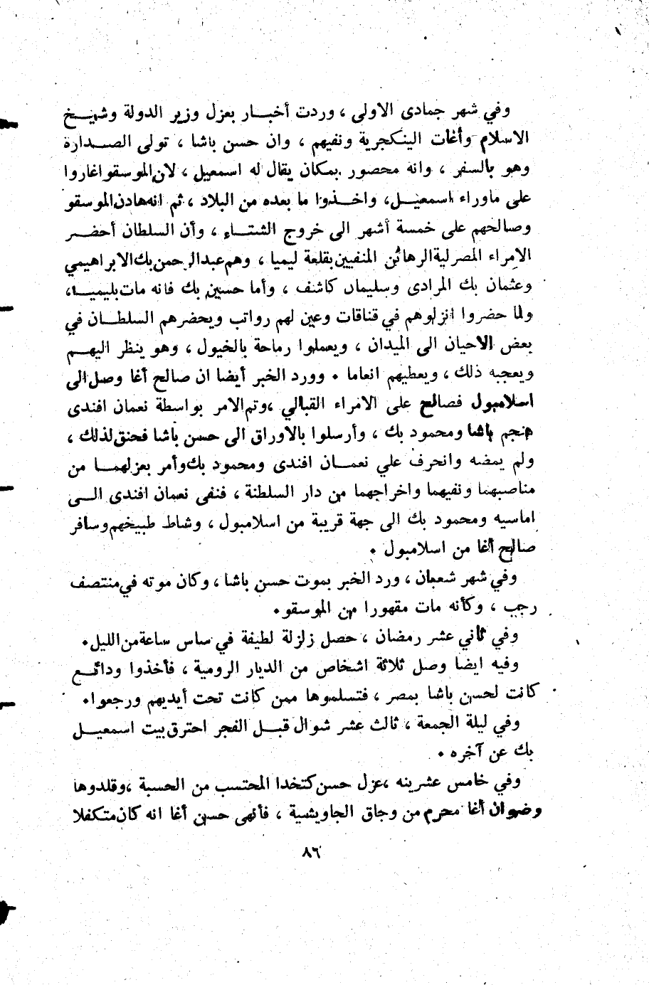 وفي شهر جمادى الأولى وردت أخبار بعزل وزير الدولة وشيخ الإسلام وأغات الينكجرية ونفيهم وأن حسن باشا تولى الصدارة وهو بالسفر وأنه محصور بمكان يقال له إسمعيل لأن الموسقو أغاروا على ما وراء إسمعيل وأخذوا ما بعده من البلاد ثم إنه هادن الموسقو وصالحهم على خمسة أشهر إلى خروج الشتاء وأن السلطان أحضر الأمراء المصرلية الرهائن المنفيين بقلعة ليميا وهم عبد الرحمن بك الإبراهيمي وعثمان بك المرادي وسليمان كاشف وأما حسين بك فإنه مات بليميا ولما حضروا أنزلوهم في قناقات وعين لهم رواتب ويحضرهم السلطان في بعض الأحيان إلى الميدان ويعملوا رماحة بالخيول وهو ينظر إليهم ويعجبه ذلك ويعطيهم أنعاما وورد الخبر أيضا أن صالح أغا وصل إلى اسلامبول فصالح على الأمراء القبالي وتم الأمر بواسطة نعمان أفندي منجم باشا ومحمود بك وأرسلوا بالأوراق إلى حسن باشا فحنق لذلك ولم يمضه وانحرف علي نعمان أفندي ومحمود بك وأمر بعزلهما من مناصبهما ونفيهما واخراجهما من دار السلطنة فنفى نعمان أفندي إلى أماسيه ومحمود بك إلى جهة قريبة من اسلامبول وشاط طبيخهم وسافر صالح اغا من اسلامبول.