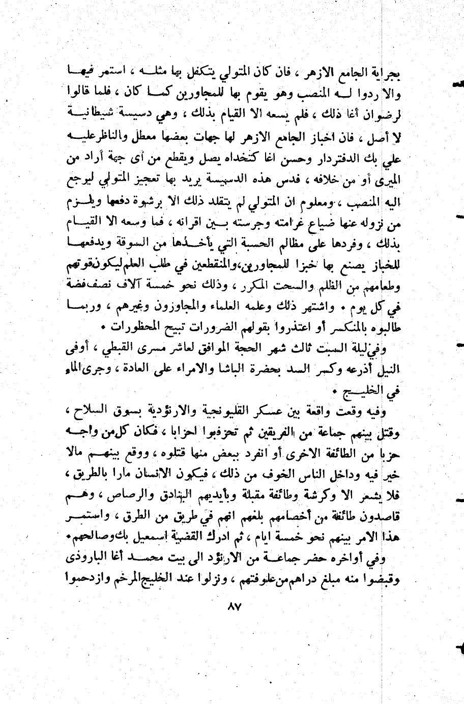 بجراية الجامع الأزهر فإن كان المتولي يتكفل بها مثله استمر فيها وإلا ردوا له المنصب وهو يقوم بها للمجاورين كما كان فلما قالوا لرضوان اغا: ذلك فلم يسمعه إلا القيام بذلك وهي دسيسة شيطانية لا أصل فإن أخبار الجامع الأزهر لها جهات بعضها معطل والناظر عليه علي بك الدفتردار وحسن اغا كتخداه يصل ويقطع من أي جهة أراد من الميري أو من خلافه فدس هذه الدسيسة يريد بها تعجيز المتولي ليرجع إليه المنصب ومعلوم أن المتولي لم يتقلد ذلك إلا برشوة دفعها ويلزم من نزوله عنها ضياع غرامته وجرسته بين اقرانه فما وسعه إلا القيام بذلك وفردها على مظالم الحسبة التي يأخذها من السوقة ويدفعها للخباز يصنع بها خبزا للمجاورين والمنقطعين في طلب العلم ليكون قوتهم وطعامهم من الظلم والسحت المكرر وذلك نحو خمسة آلاف نصف فضة في كل يوم واشتهر ذلك وعلمه العلماء والمجاوزون وغيرهم وربما طالبوه بالمنكسر أو اعتذروا بقولهم الضرورات تبيح المحظورات.