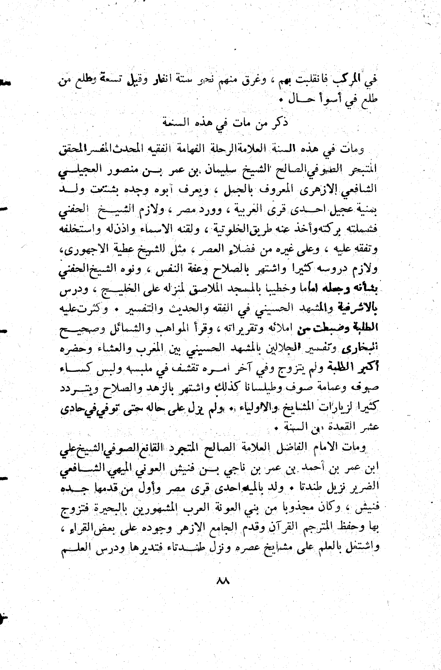ومات في هذه السنة العلامة الرحلة الفهامة الفقيه المحدث المفسر المحقق المتبحر الصوفي الصالح الشيخ سليمان بن عمر بن منصور العجيلي الشافعي الأزهري المعروف بالجمل ويعرف أبوه وجده بشننت ولد بمنية عجيل أحدى قرى الغربية وورد مصر ولازم الشيخ الحفني فشملته بركته وأخذ عنه طريق الخلوتية ولقنه الأسماء وأذن له واستخلفه وتفقه عليه وعلى غيره من فضلاء العصر مثل للشيخ عطية الاجهوري ولازم دروسه كثيرا واشتهر بالصلاح وعفة النفس ونوه الشيخ الحفني بشأنه وجعله اماما وخطيبا بالمسجد الملاصق لمنزله على الخليج ودرس بالاشرفيه والمشهد الحسيني في الفقه والحديث والتفسير وكثرت عليه الطلبة وضبطت من املائه وتقريراته وقرأ المواهب والشمائل وصحيح البخاري وتفسير الجلالين بالمشهد الحسيني بين المغرب والعشاء وحضره أكبر الطلبة ولم يتزوج وفي آخر أمره تقشف في ملبسه ولبس كساء صوف وعمامة صوف وطيلسانا كذلك واشتهر بالزهد والصلاح ويتردد كثيرا لزيارات المشايخ والأولياء ولم يزل على حاله حتى توفي في حادي عشر القعدة من السنة.