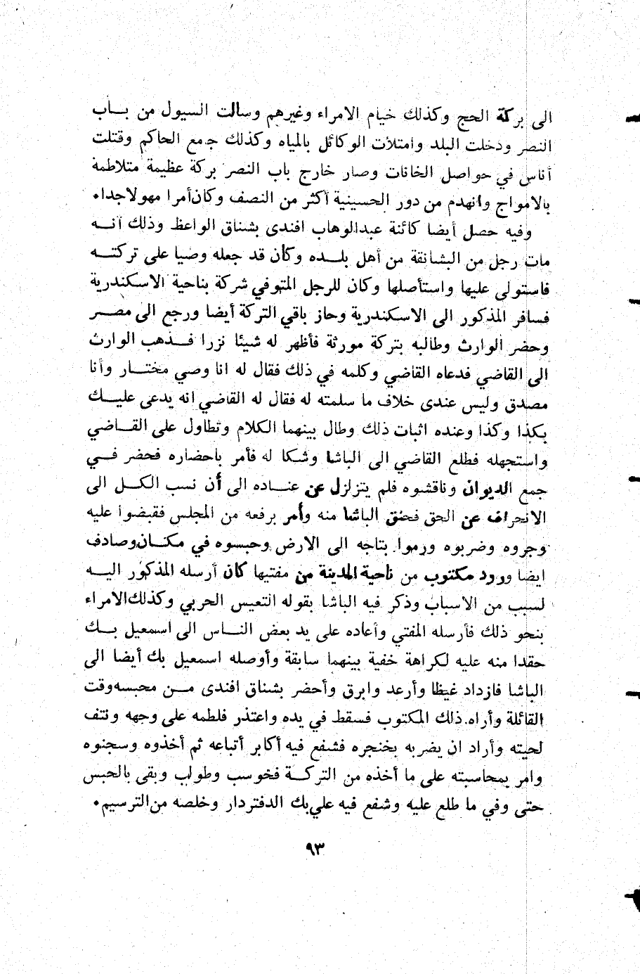 وفيه حصل أيضا كائنة عبد الوهاب أفندي بشناق الواعظ وذلك أنه مات رجل من البشانقة من أهل بلده وكان قد جعله وصيا على تركته فاستولى عليها واستأصلها وكان للرجل المتوفي شركة بناحية الأسكندرية فسافر المذكور إلى الأسكندرية وحاز باقي التركة أيضا ورجع إلى مصر وحضر الوارث وطالبه بتركة مورثه فأظهر له شيئا نزرا فذهب الوارث إلى القاضي فدعاه القاضي وكلمه في ذلك فقال له أنا وصي مختار وأنا مصدق وليس عندي عندي خلاف ما سلمته له فقال له القاضي أنه يدعى عليك بكذا وكذا وعنده اثبات ذلك وطال بينهما الكلام وتطاول على القاضي واستجهله فطلع القاضي إلى الباشا وشكا له فأمر باحضاره فحضر في جمع الديوان وناقشوه فلم يتزلزل عن عناده إلى أن نسب الكل إلى الانحراف عن الحق فحنق الباشا منه وأمر برفعه من المجلس فقبضوا عليه وجروه وضربوه ورموا بتاجه إلى الأرض وحبسوه في مكان وصادف أيضا ورود مكتوب من ناحية المدينة من مفتيها كان أرسله المذكور إليه لسبب من الأسباب وذكر فيه الباشا بقوله التعيس الحربي وكذلك الأمراء بنحو ذلك فأرسله المفتي وأعاده على يد بعض الناس إلى إسمعيل بك حقدا منه عليه لكراهة خفية بينهما سابقة وأوصلة إسمعيل بك أيضا إلى الباشا فازداد غيظا وأرعد وأبرق وأحضر بشناق أفندي من محبسه وقت القائلة وأراه ذلك المكتوب فسقط في يده واعتذر فلطمه على وجهه ونتف لحيته وأراد أن يضربه بخنجره فشفع فيه أكابر أتباعه ثم أخذوه وسجنوه وامر بمحاسبته على ما أخذه من التركة فحوسب وطولب وبقي بالحبس حتى وفي ما طلع عليه وشفع فيه علي بك الدفتردار وخلصه من الترسيم