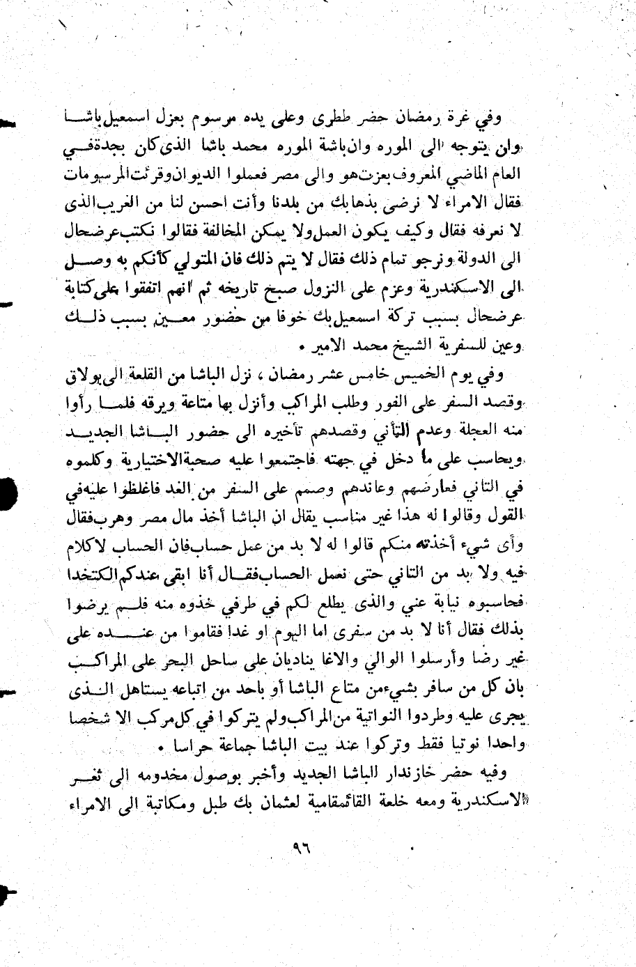 وفي غرة رمضان حضر ططرى وعلى يده مرسوم بعزل إسمعيل باشا ولن يتوجه إلى الموره وأن باشة الموره محمد باشا الذي كان بجدة في العام الماضي المعروف بعزت هو وإلى مصر فعملوا الديوان وقرئت المرسومات فقال الأمراء لا نرضى بذهابك من بلدنا وأنت أحسن لنا من الغريب الذي لا نعرفه فقال: وكيف يكون العمل ولا يمكن المخالفة فقالوا: نكتب عرضحال إلى الدولة ونرجو تمام ذلك فقال: لا يتم ذلك فإن المتولي كأنكم به وصل إلى الأسكندرية وعزم على النزول صبح تاريخه ثم أنهم اتفقوا على كتابه عرضحال بسبب تركة إسمعيل بك خوفا من حضور معين بسبب ذلك وعين للسفرية الشيخ محمد الأمير.