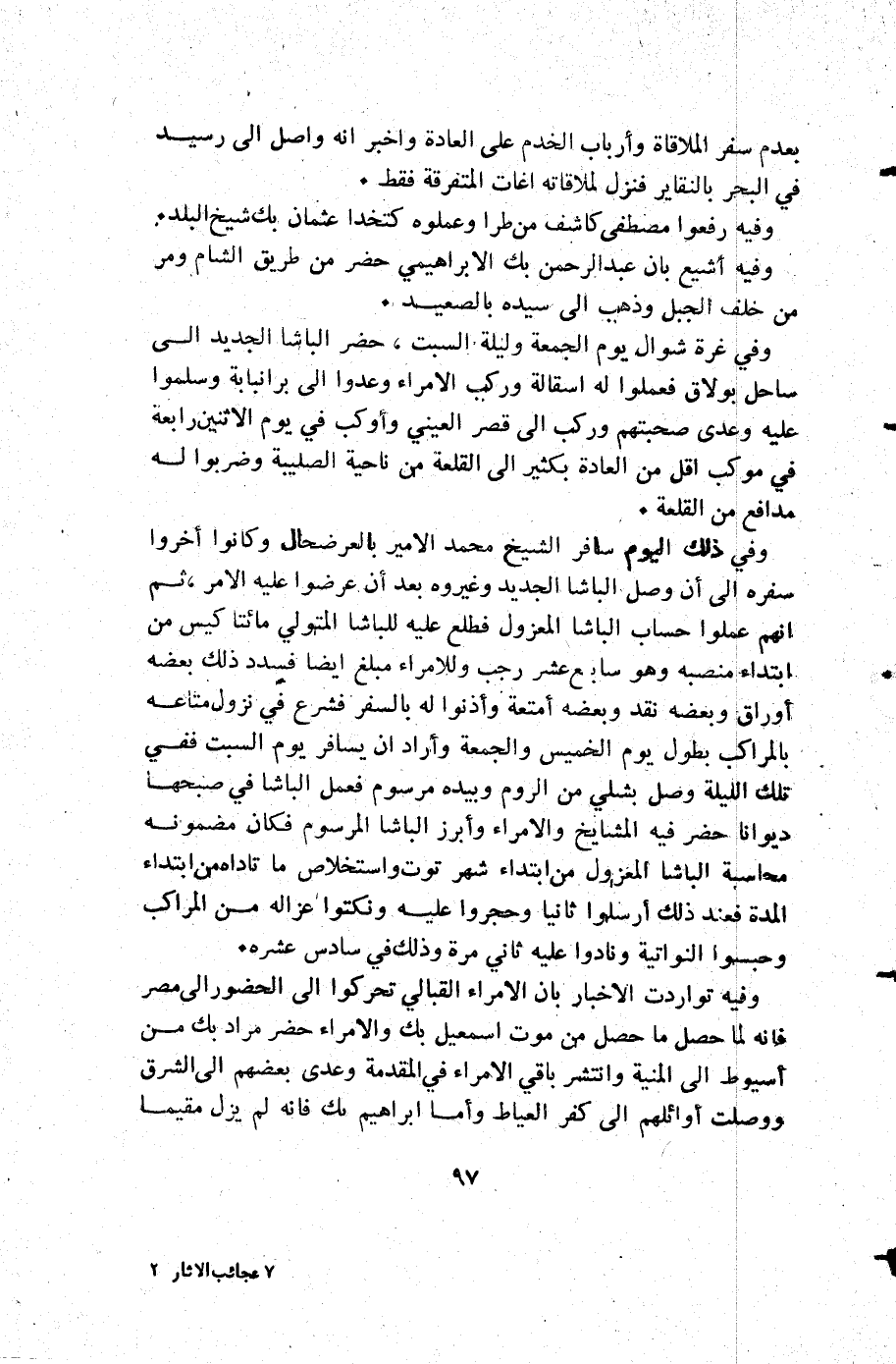 وفي ذلك اليوم سافر الشيخ محمد الأمير بالعرضحال وكانوا آخروا سفره إلى أن وصل الباشا الجديد وغيره بعد أن عرضوا عليه الأمر ثم أنهم عملوا حساب الباشا المعزول فطلع عليه للباشا المتولي مائتا كيس من ابتداء منصبه وهو سابع عشر رجب وللامراء مبلغ أيضا فسدد ذلك بعضه أوراق وبعضه نقد وبعضه أمتعة وأذنوا له بالسفر فشرع في نزول متاعه بالمراكب بطول يوم الخميس والجمعة وأراد أن يسافر يوم السبت ففي تلك الليلة وصل بشلي من الروم وبيده مرسوم فعمل الباشا في صبحها ديوانا حضر فيه المشايخ والأمراء وأبرز الباشا المرسوم فكان مضمونه محاسبة الباشا المعزول من ابتداء شهر توت واستخلاص ما تاداه من ابتداء المدة فعند ذلك ارسلوا ثانيا وحجروا عليه ونكتوا عزاله من المراكب وحبسوا النواتية ونادوا عليه ثاني مرة وذلك في سادس عشره.